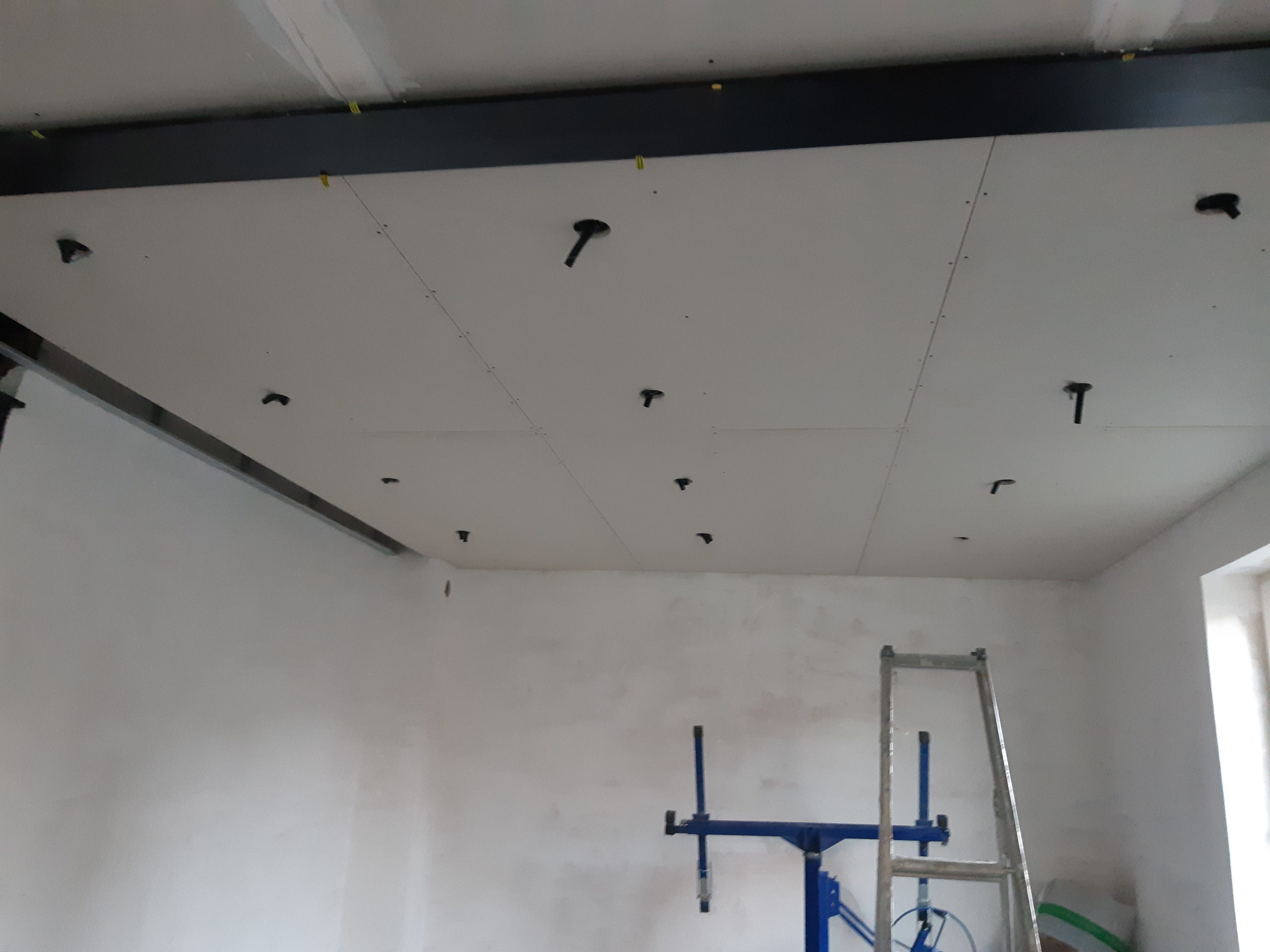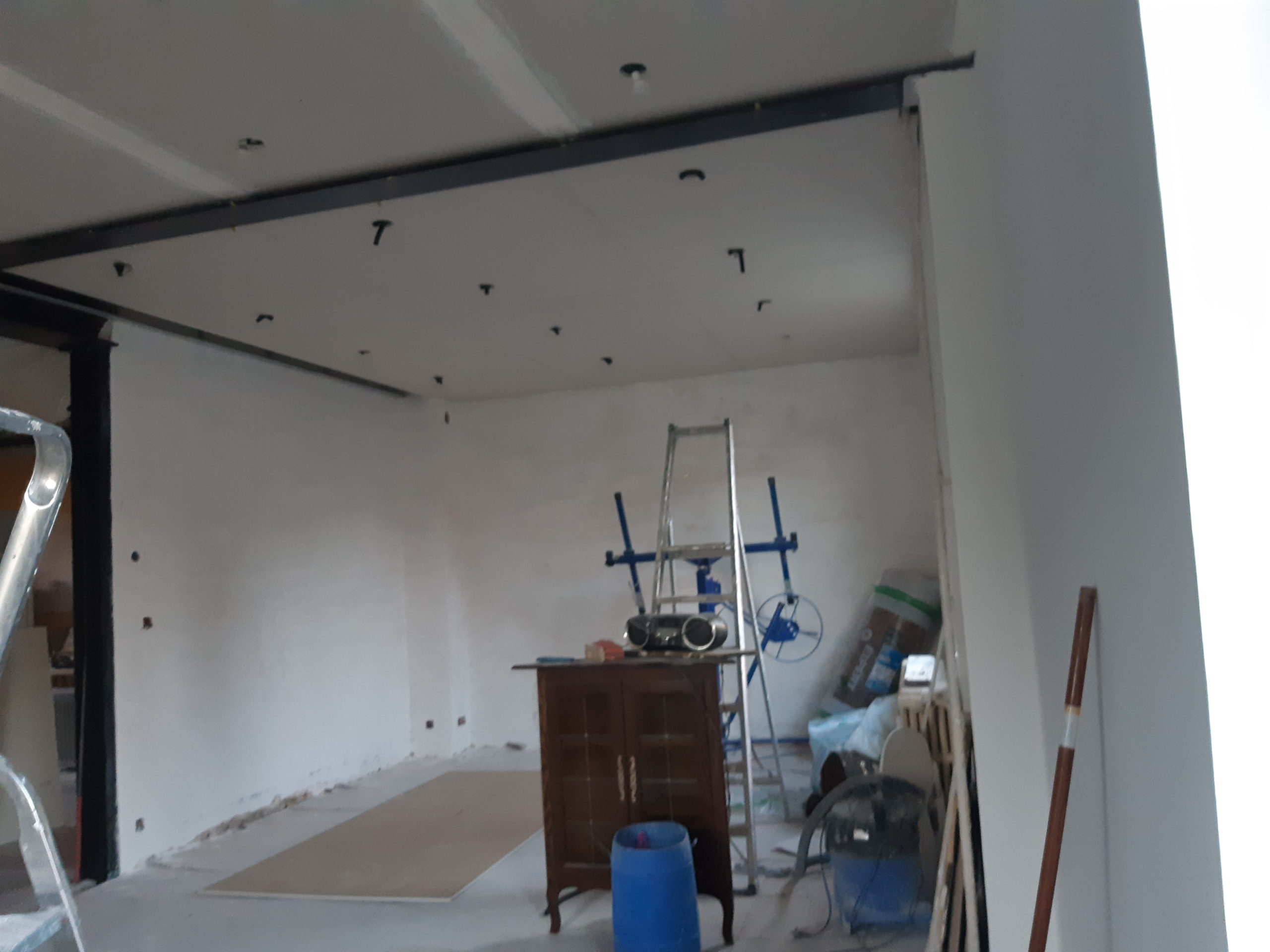 Suite du plafond dans le salon et repérage carrelage et premières découpes pour la salle de bain de la chambre.