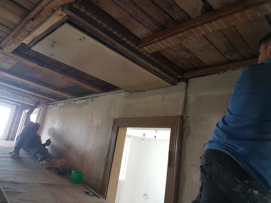 Installation des suspentes de plafond dans l’escalier avec l’échafaudage maison