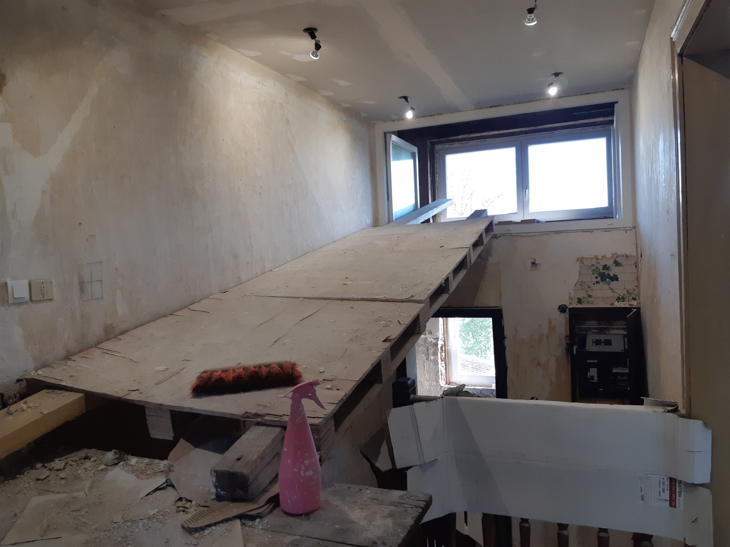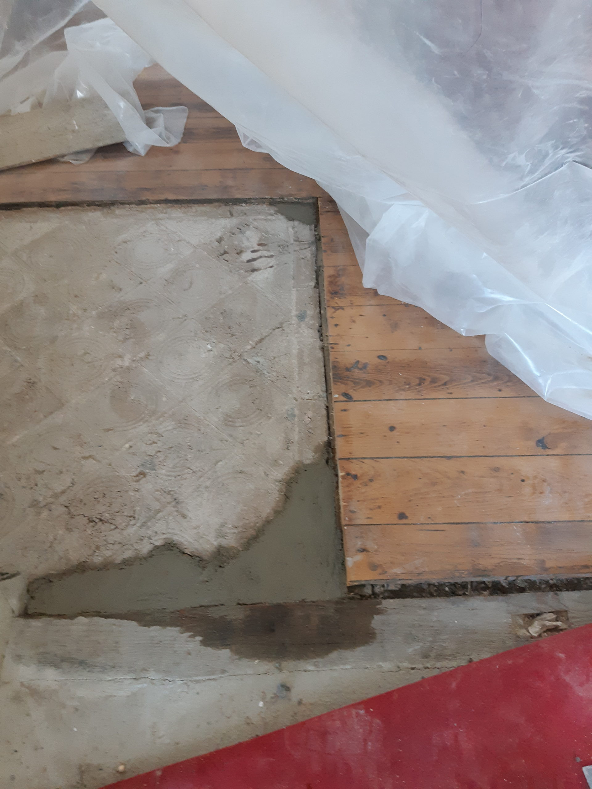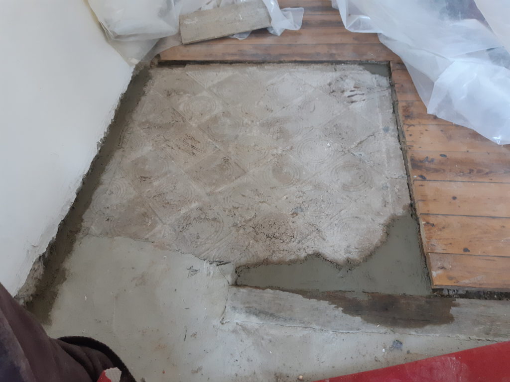 Préparation pour le carrelage sous le poêle et découpage du bois abîmé