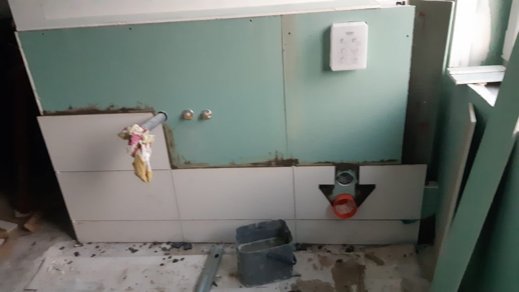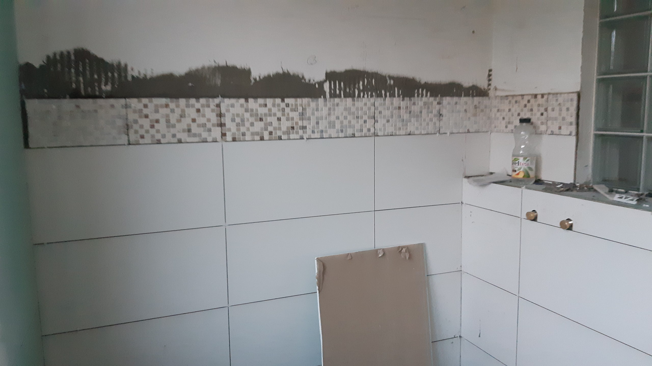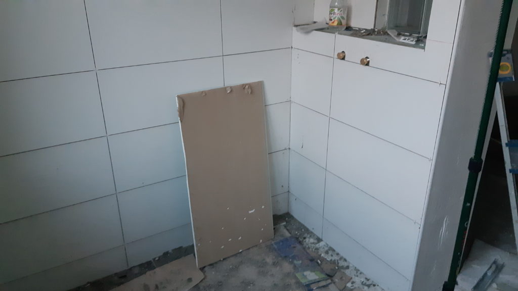 Un passage à la déchèterie puis curage de l’égout et carrelage dans la chambre. Mise en place des mozaics et carrelage du caisson