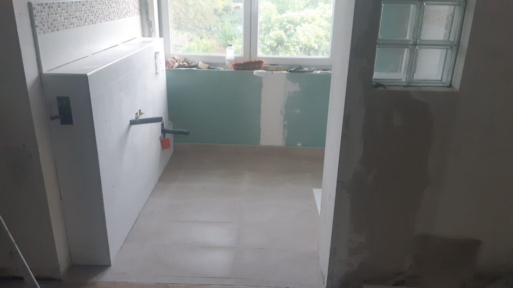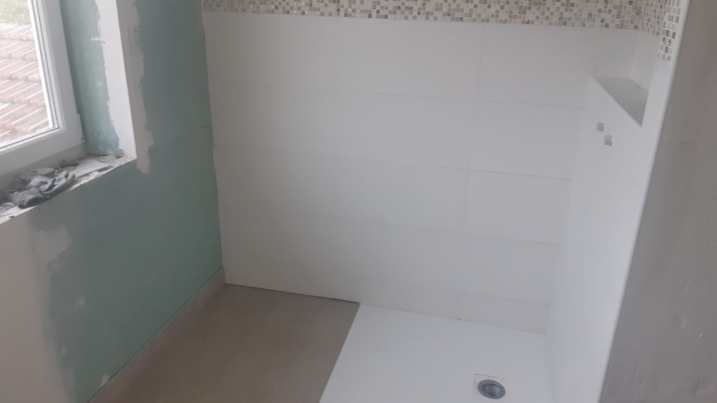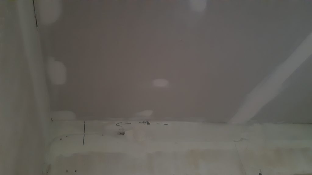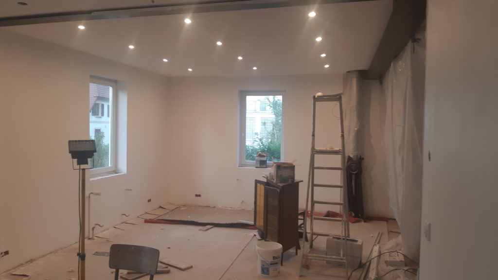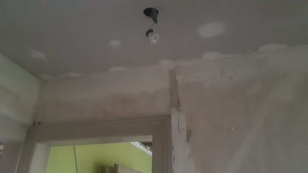Mise en place des spots au plafond dans une partie du salon. Au passage repassage de quelques fils de pilotage qui ont été coupés lors d’un malheureux coup de scie
