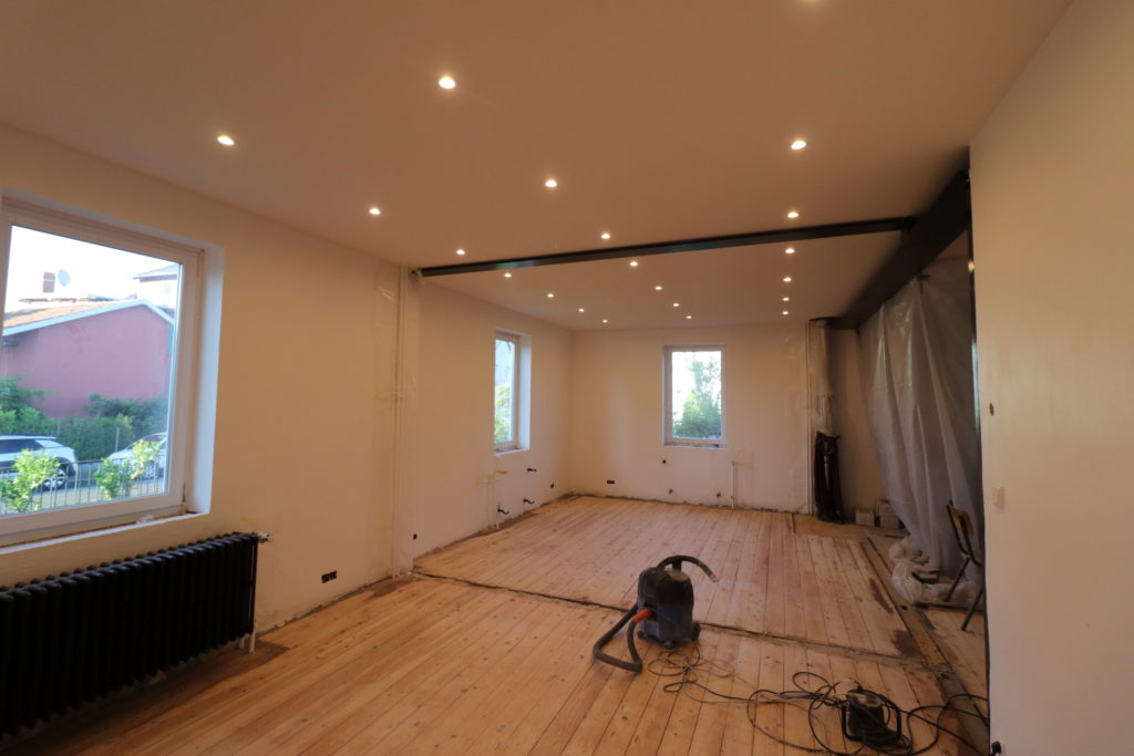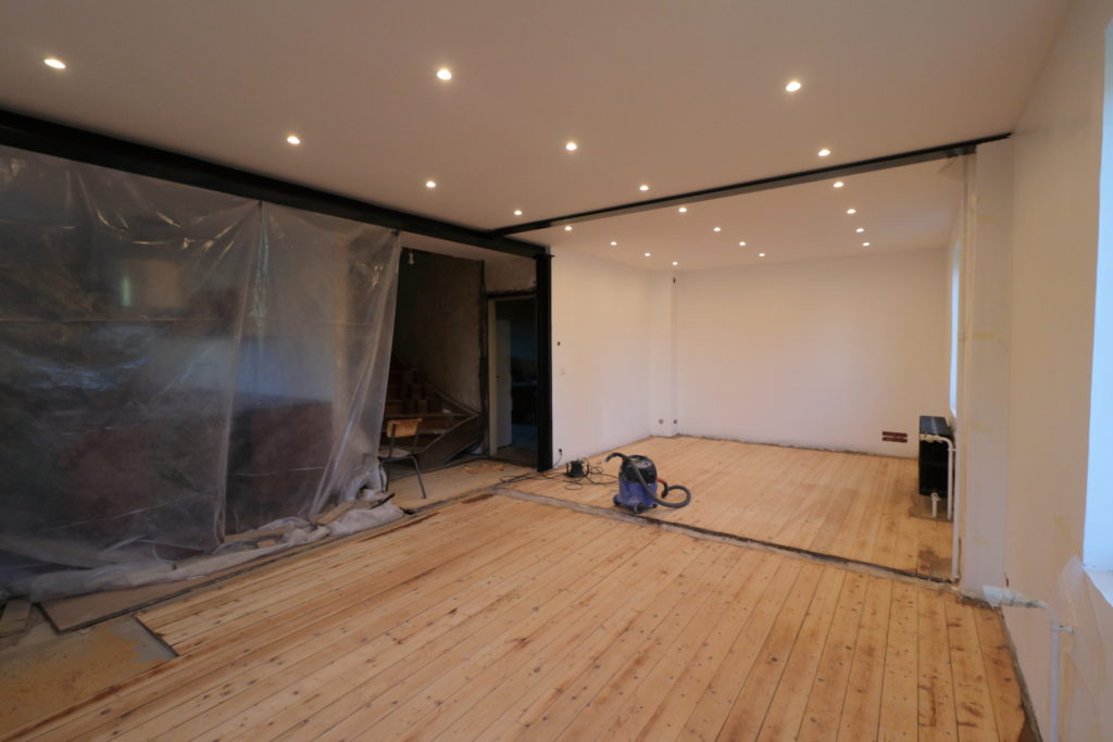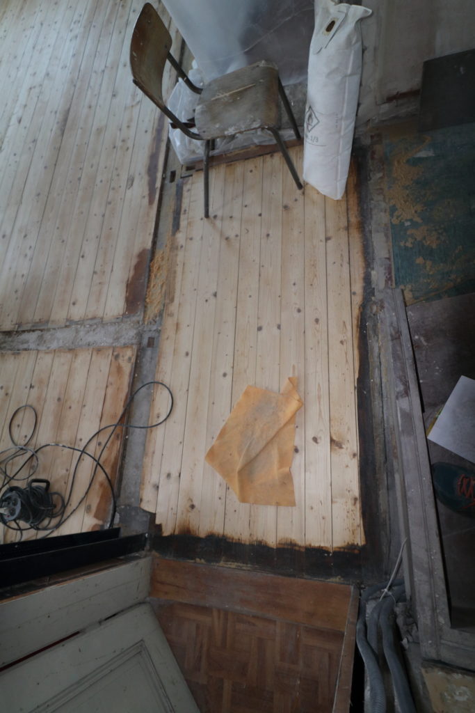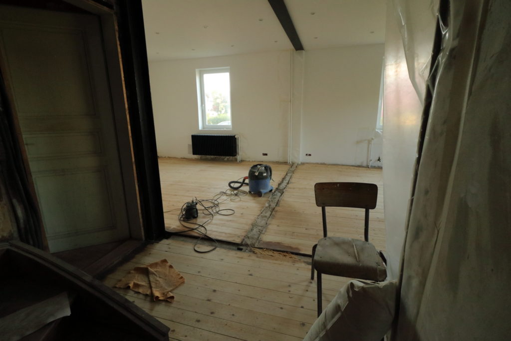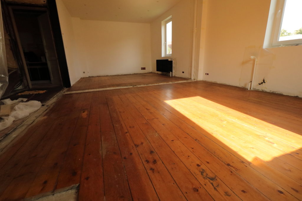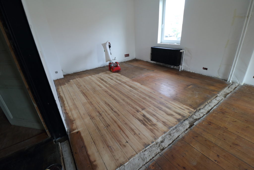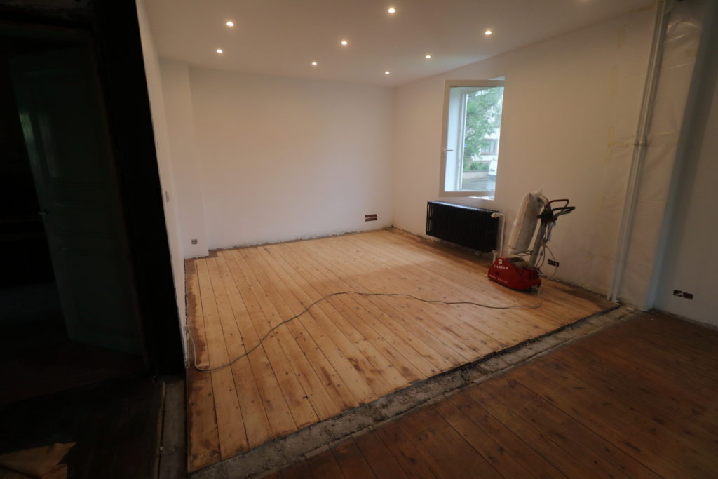 Ponçage des parquets du salon avec la ponceuse louée pour la journée chez Leroy Merlin. 8h de ponçage presque non-stop.