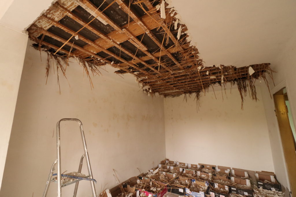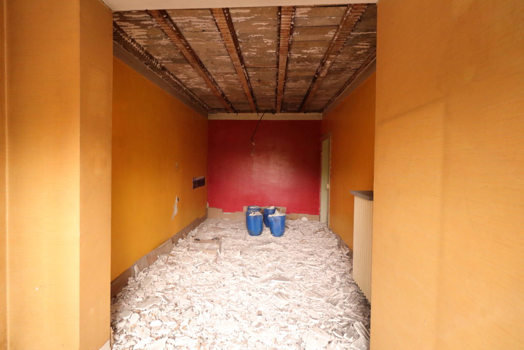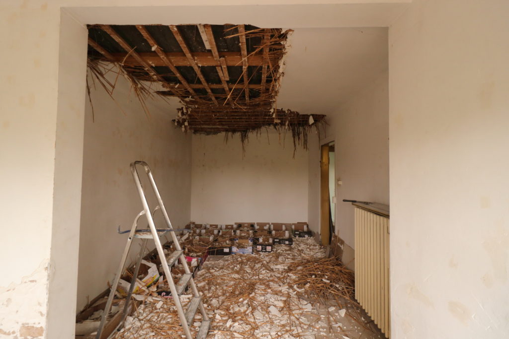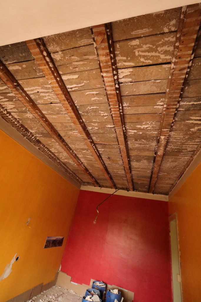 On continue la démolition des plafonds. Cette fois, c’est le deux pièces côté sud-ouest qui sont à l’honneur