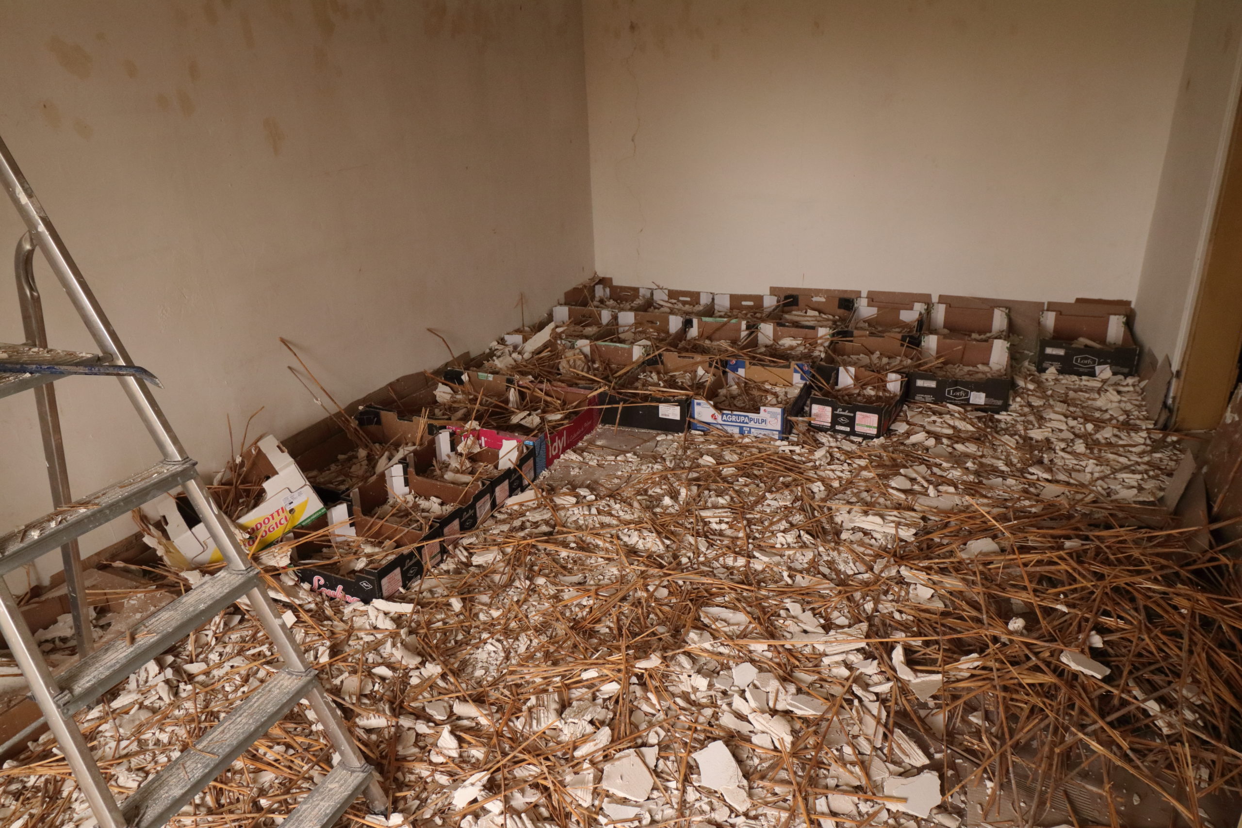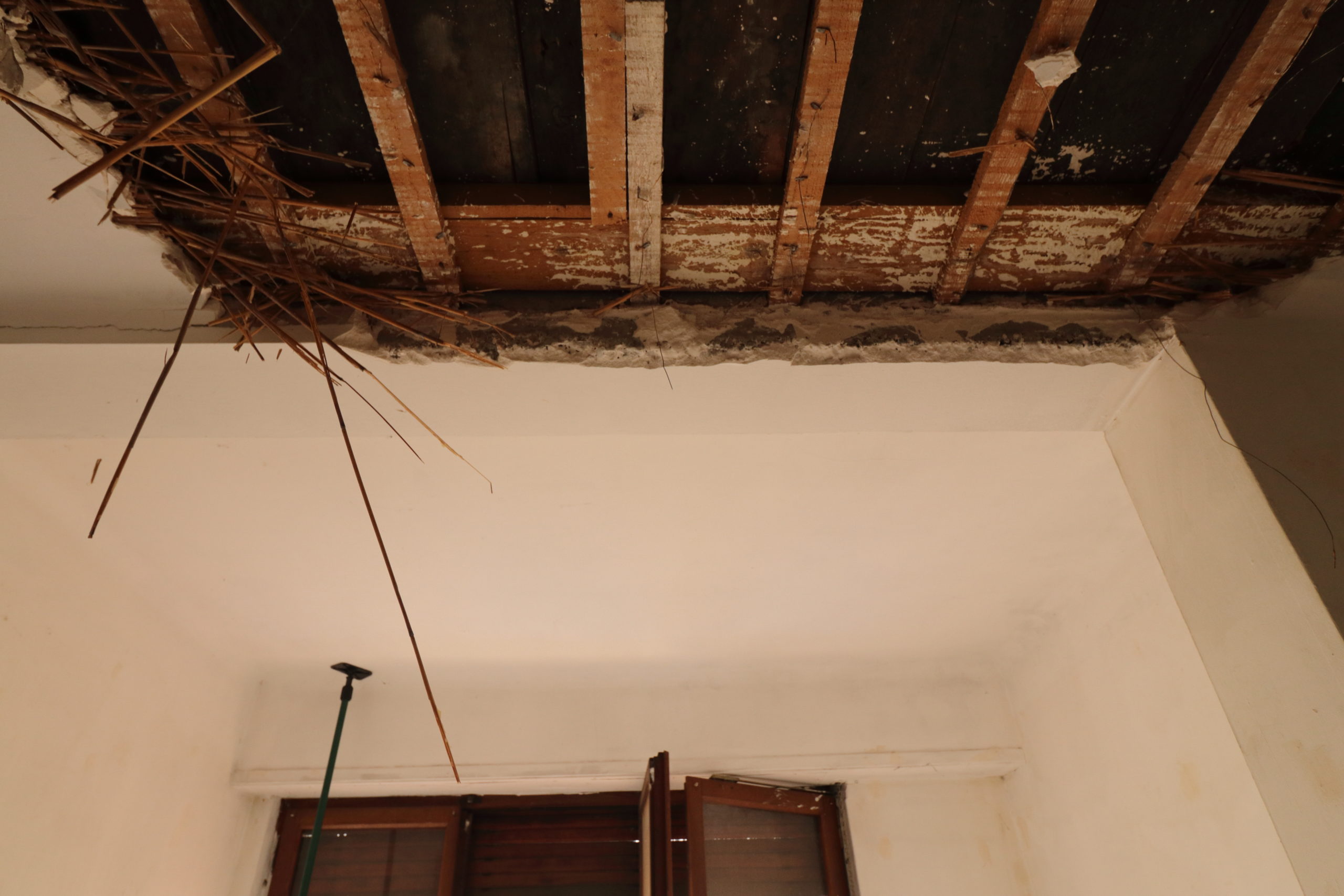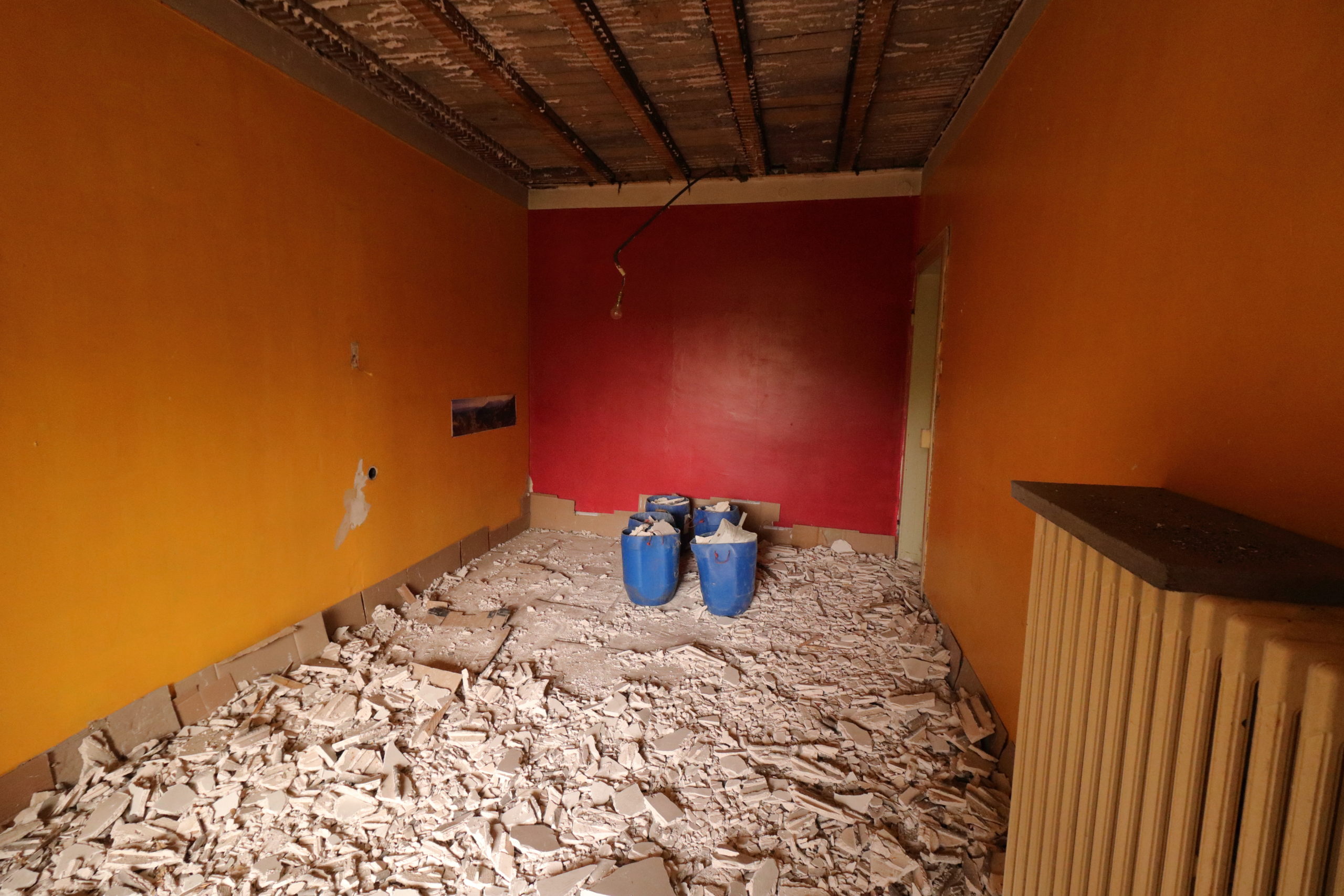 On continue la démolition des plafonds. Cette fois, c’est le deux pièces côté sud-ouest qui sont à l’honneur