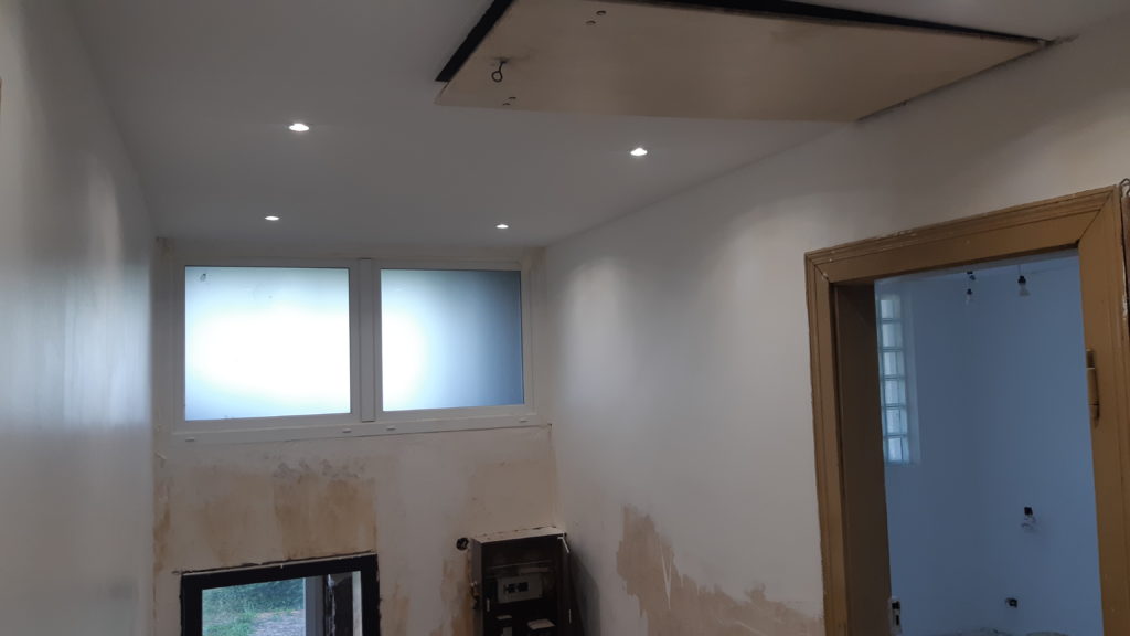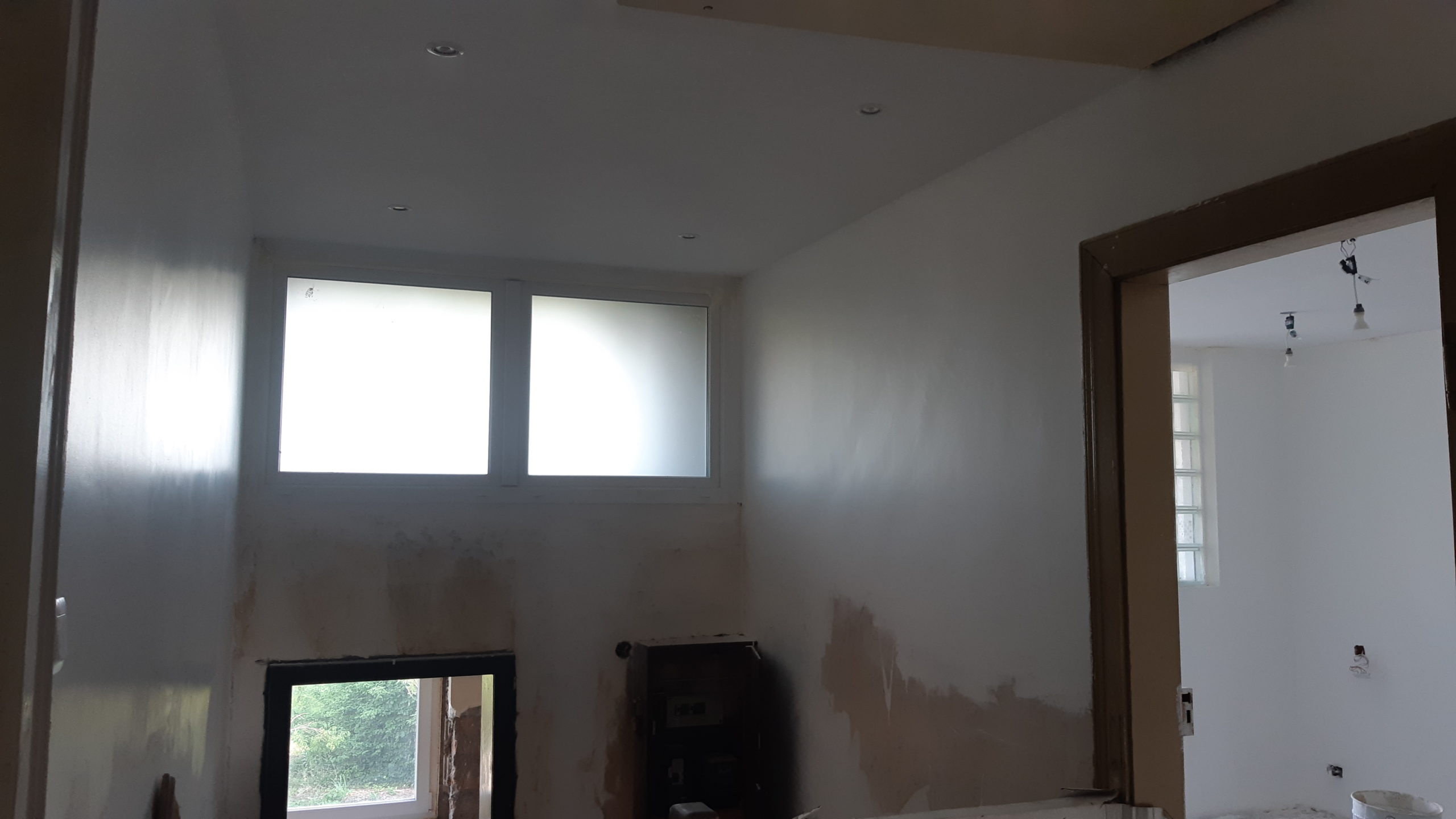 Finition de la cage de la partie nécessitant un échafaudage dans la cage d’escalier (peinture des murs) et démontage de ce dernier afin de pouvoir fermer le fenêtre donnant dans la grenier.