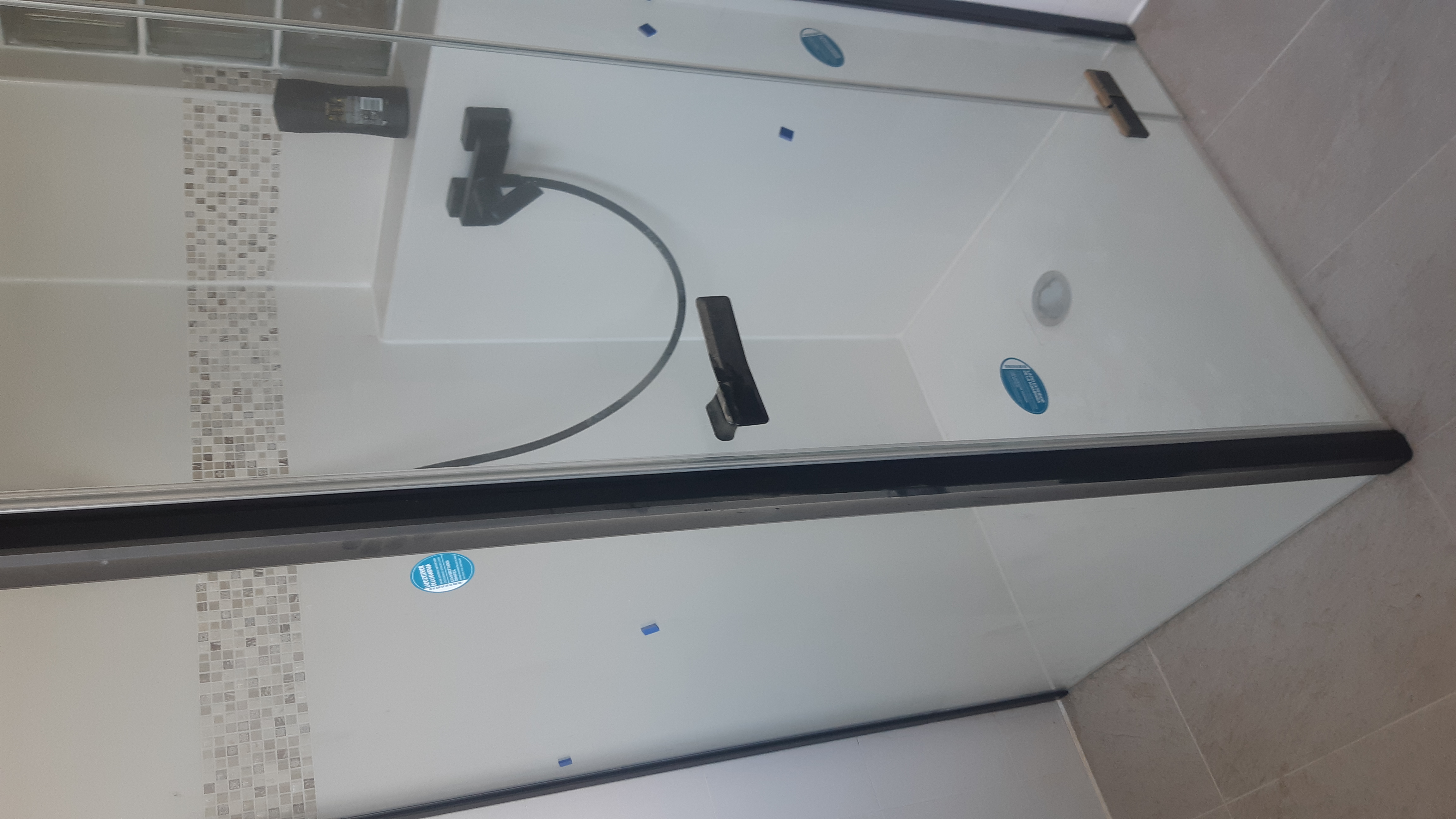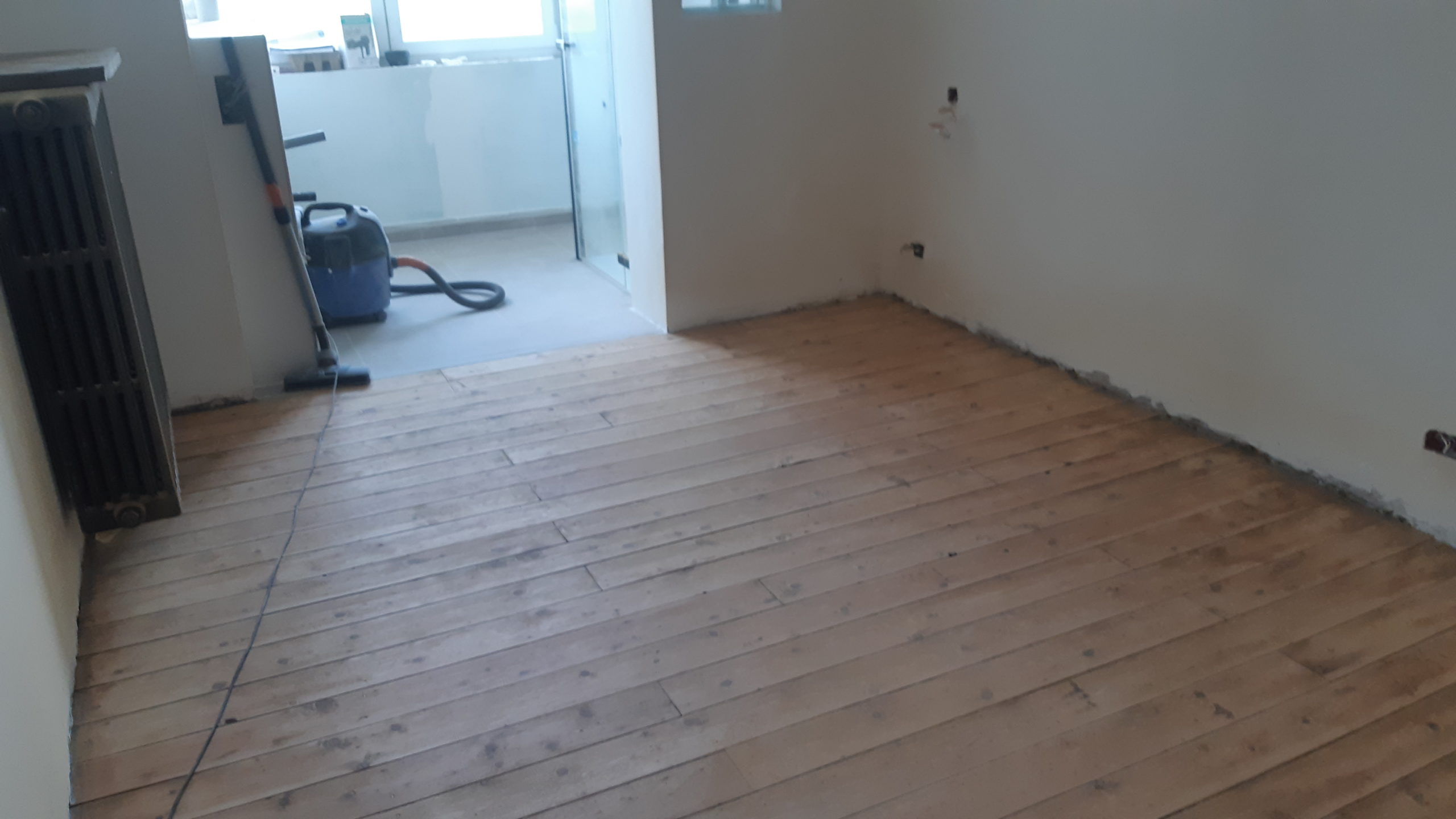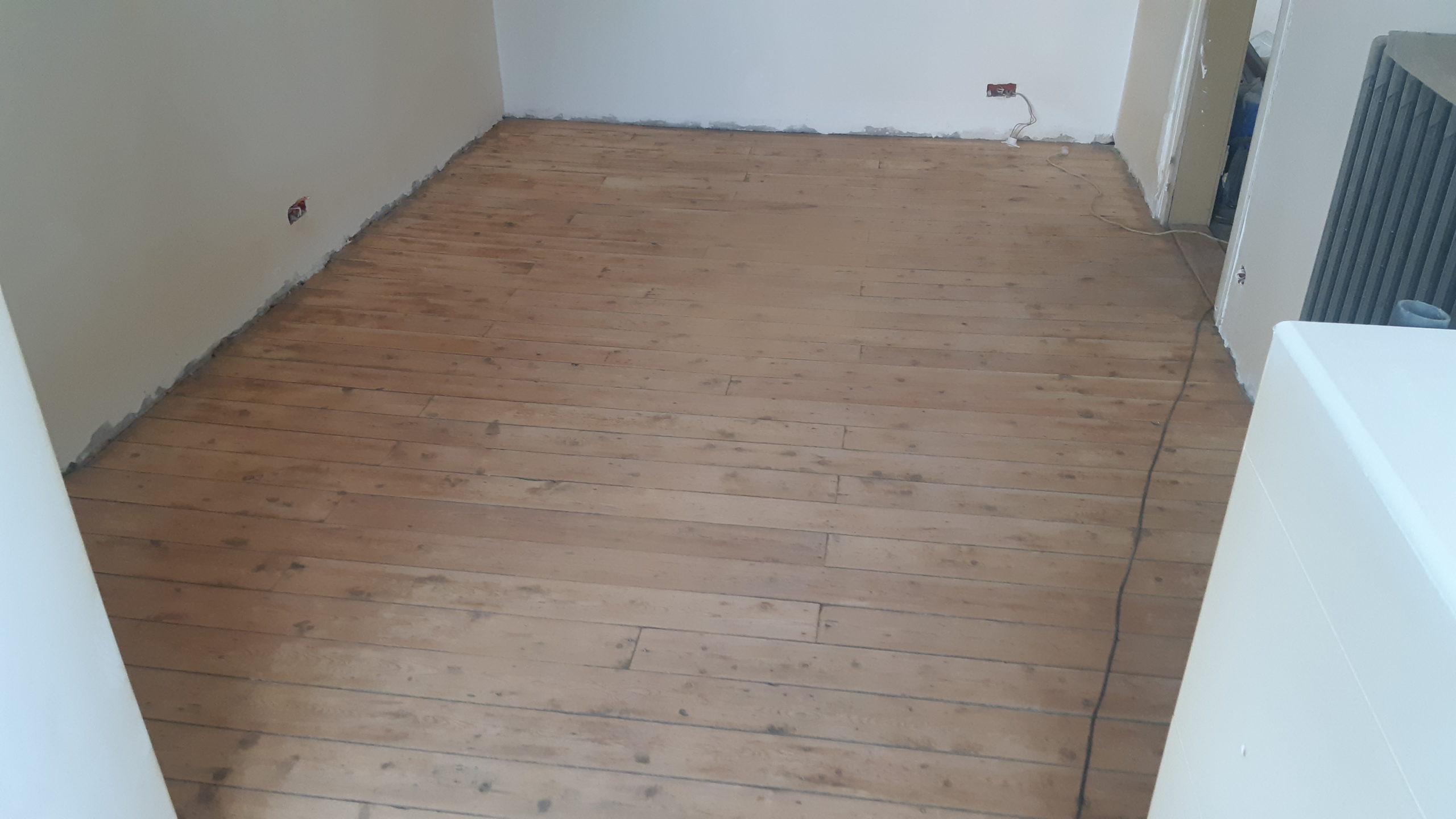 Ponçage du parquet de la chambre. Silicone dans la douche.