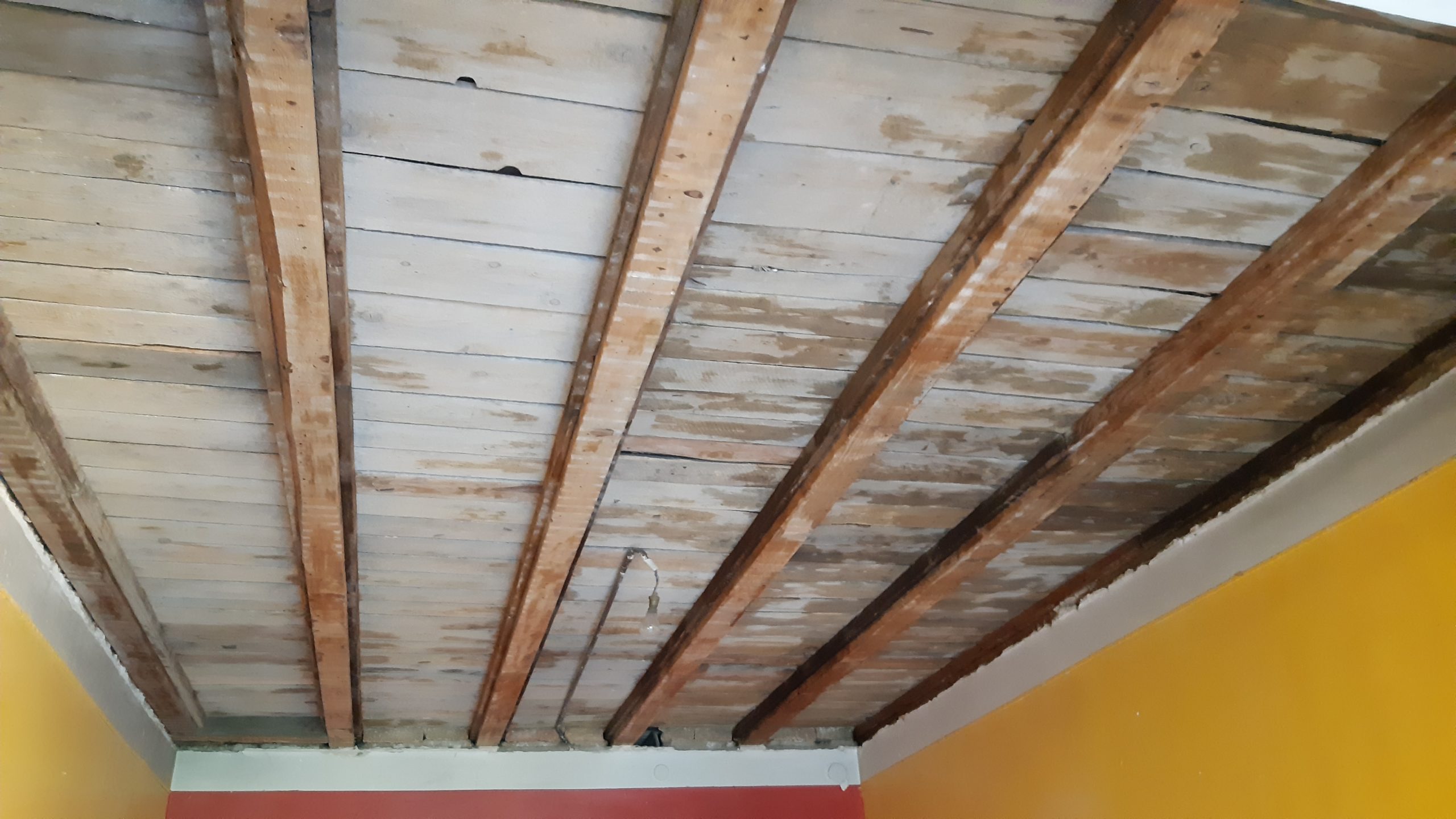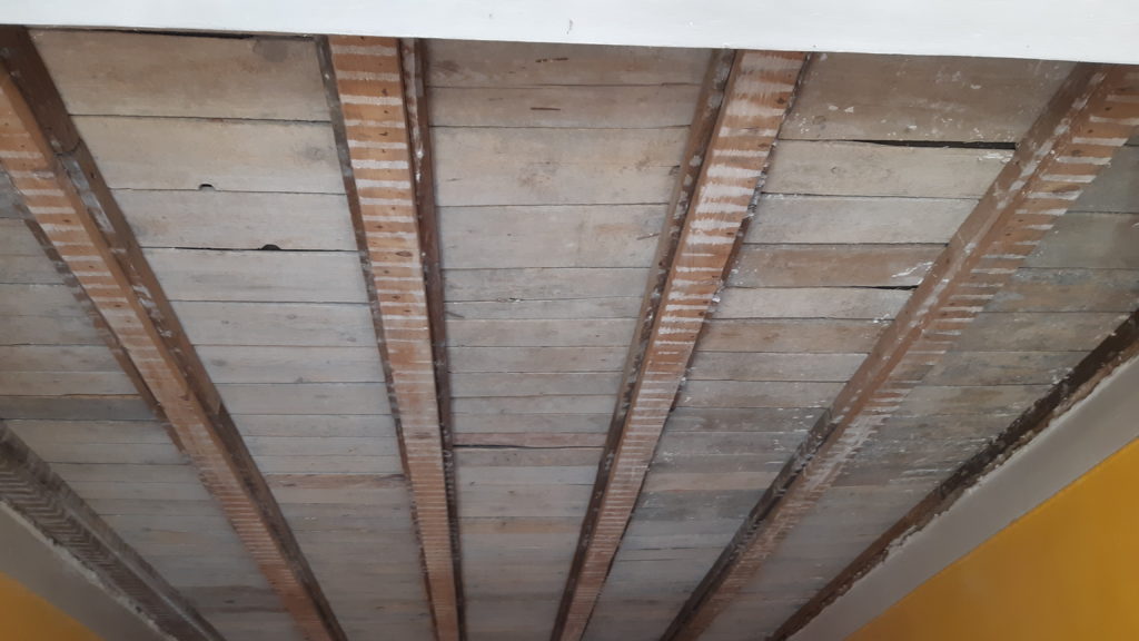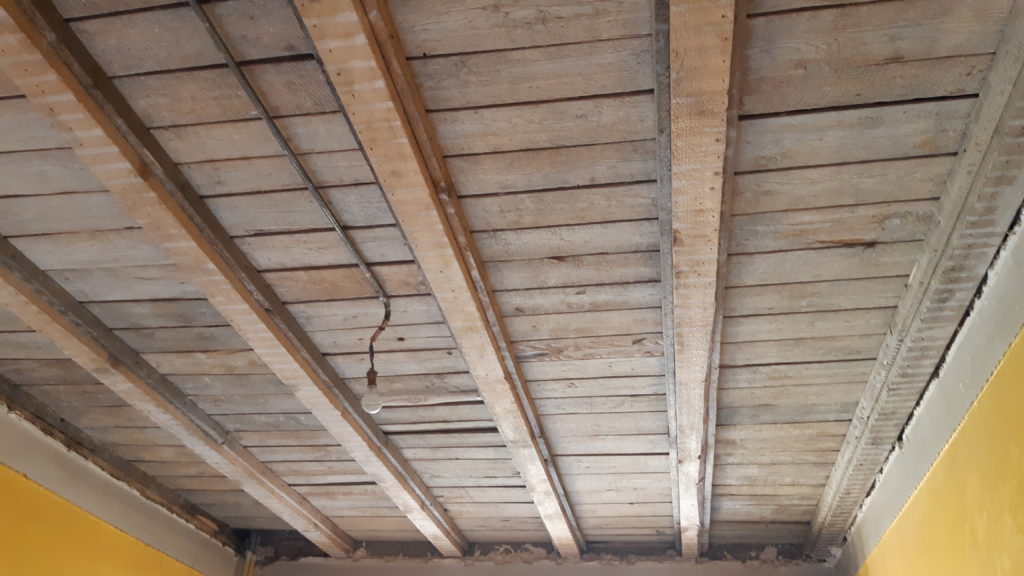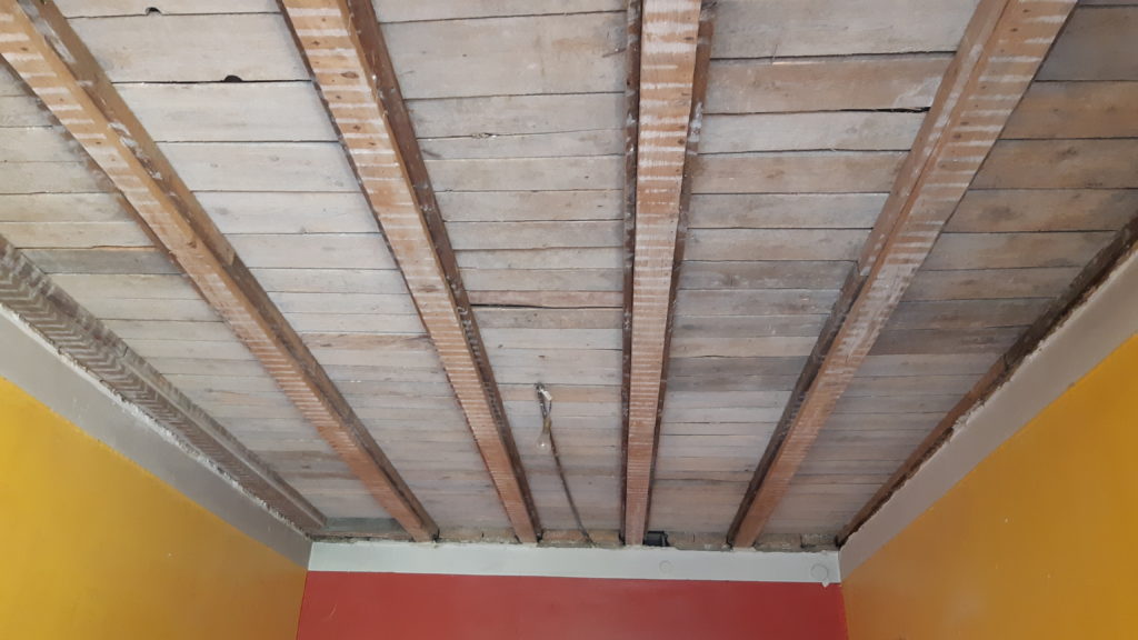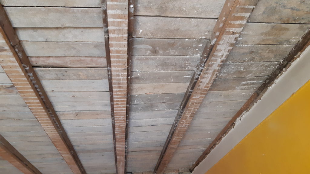 Grattage du plafond et brossage puis on le badigeon d’une couche de protection contre insectes, champignons et autres parasites du bois.