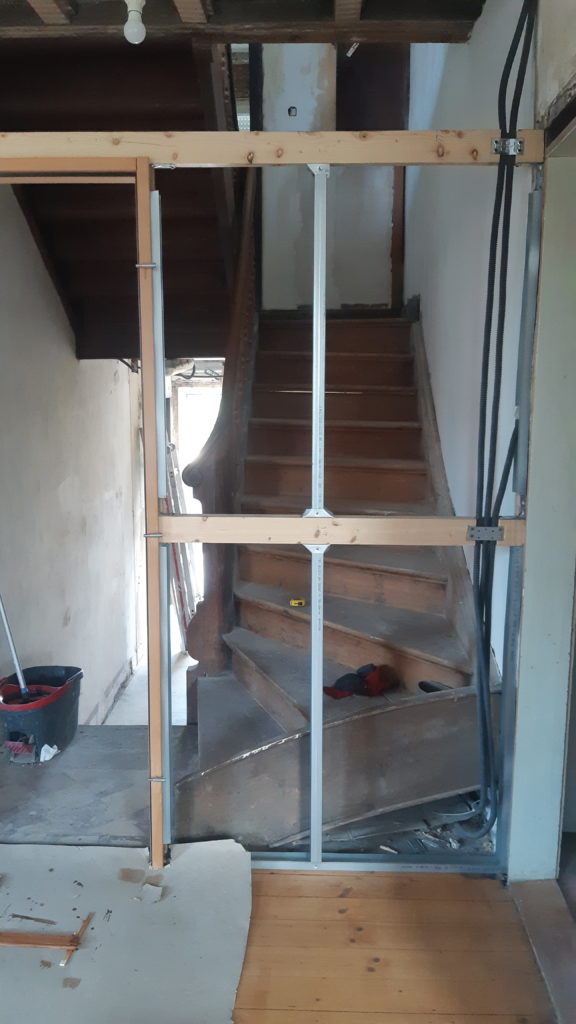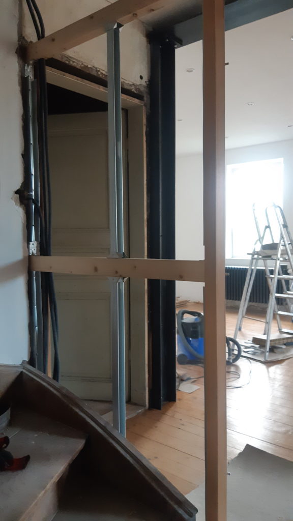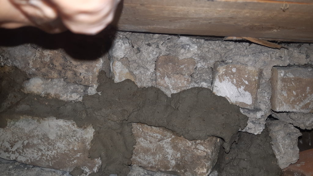 Remplissage avec du béton et 2 briques l’espace entre la grande poutre et le mur de la chambre rouge