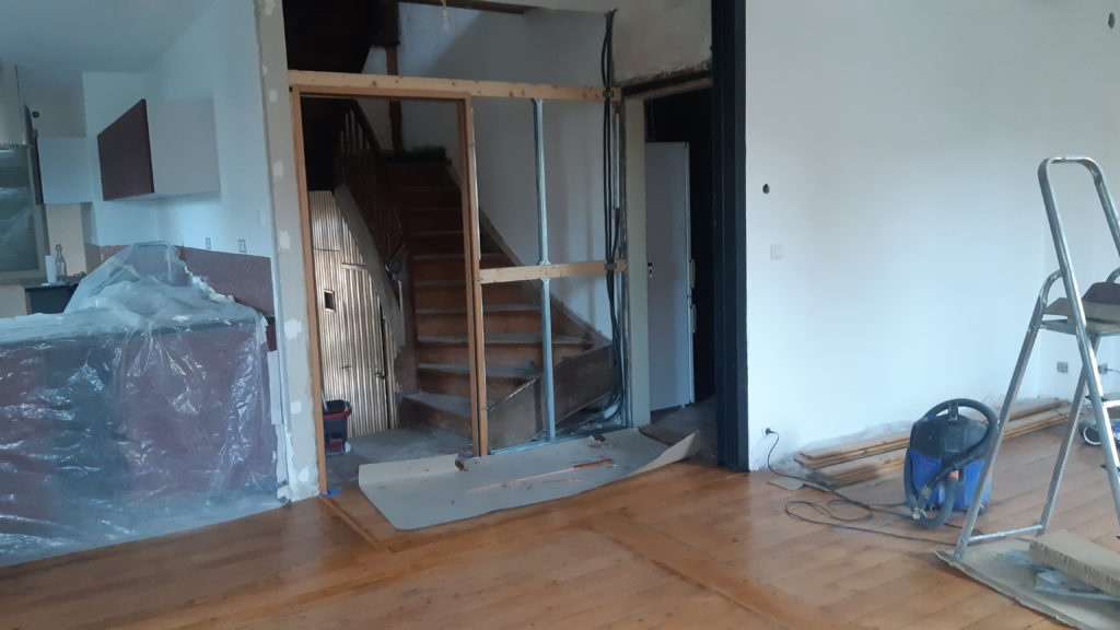 Un coup de serpillère puis nouvelle couche de vitrificateur à quelques endroits sur les raccords de sol où la couleur était différente + deuxième couche sur l’huisserie de la porte.