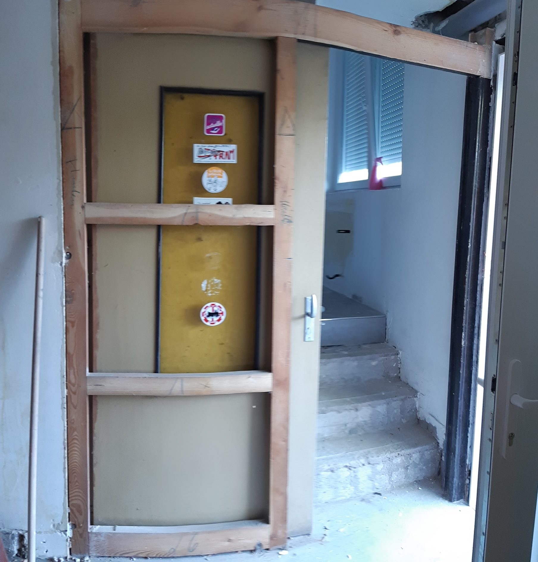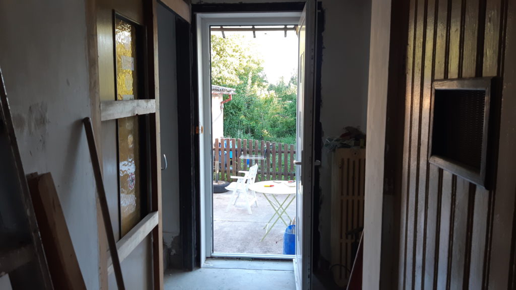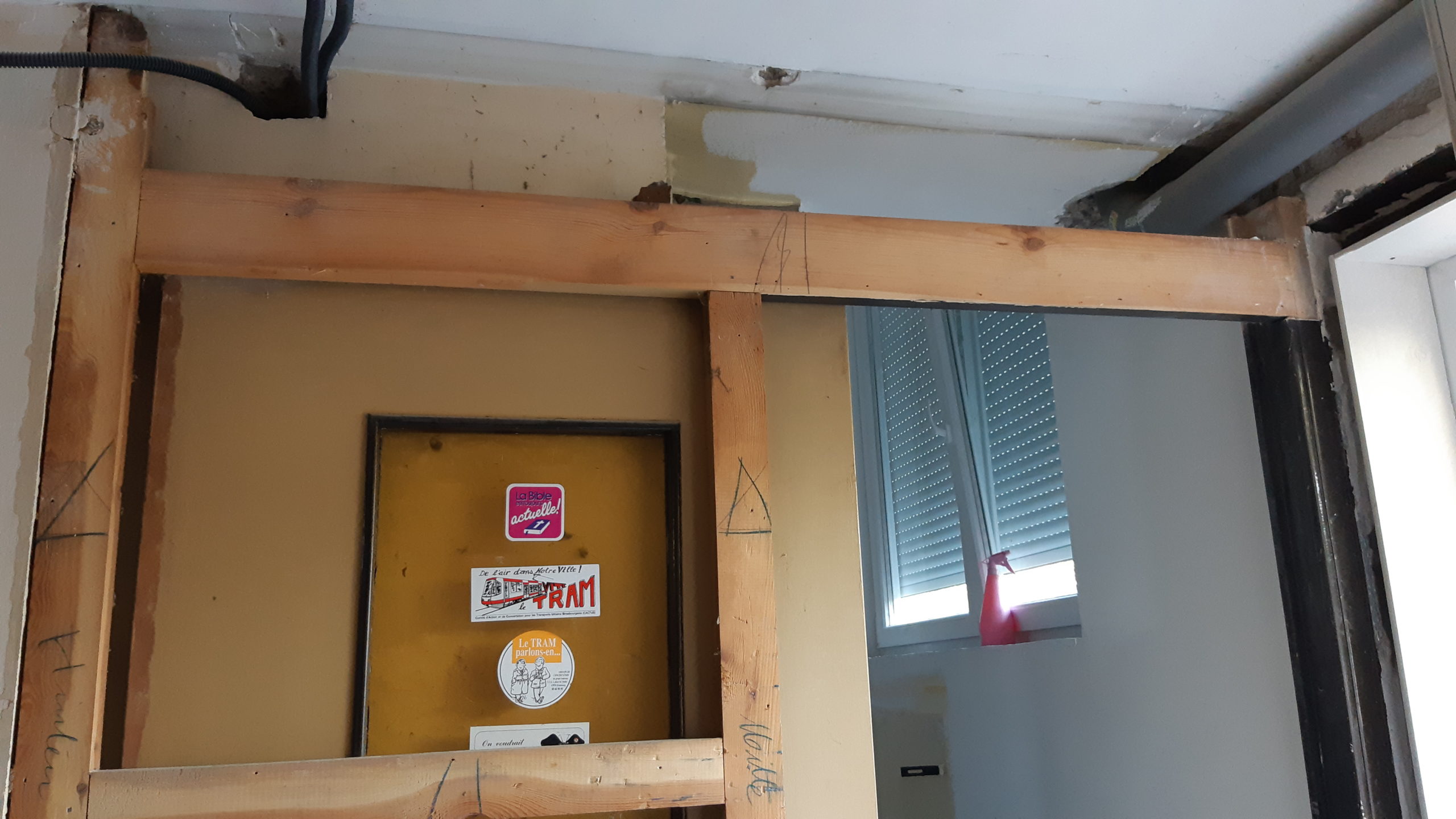 Découpe du panneau en copeau pressé de l’entrée qui cache la porte coulissante
