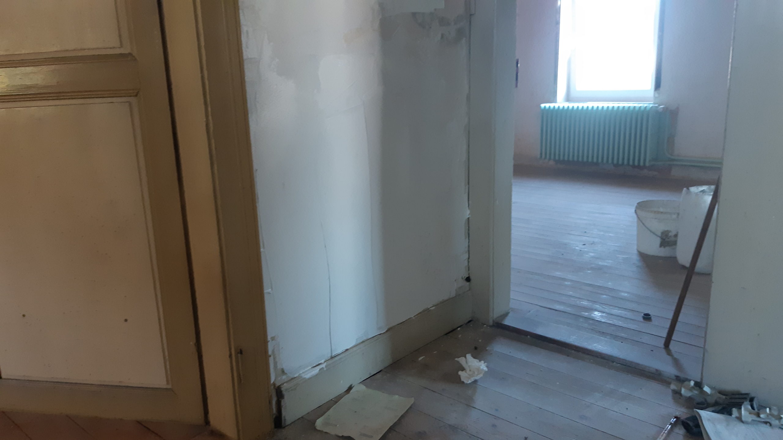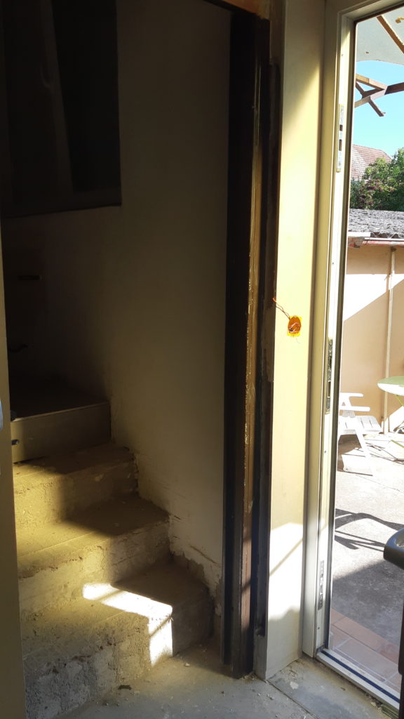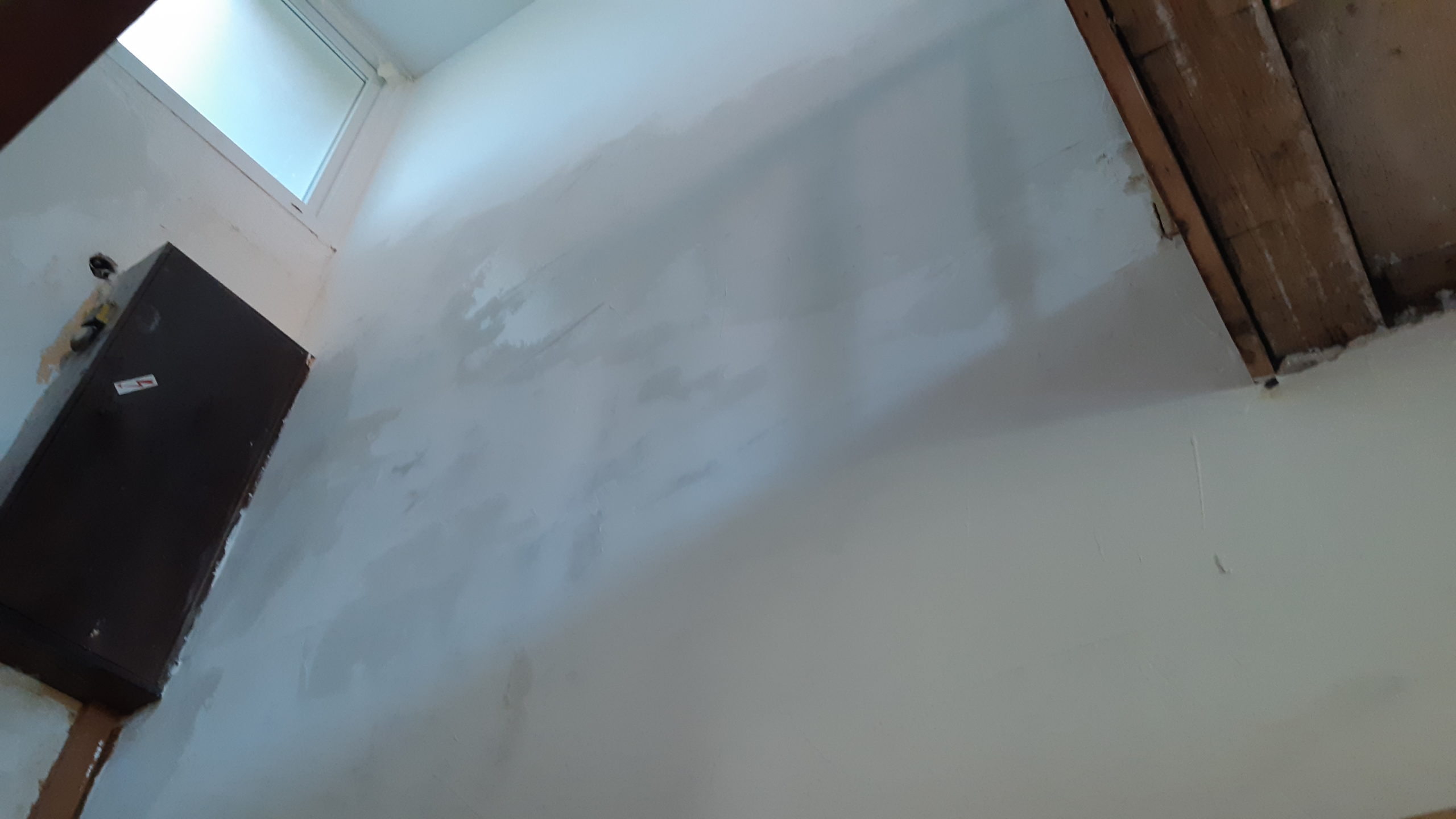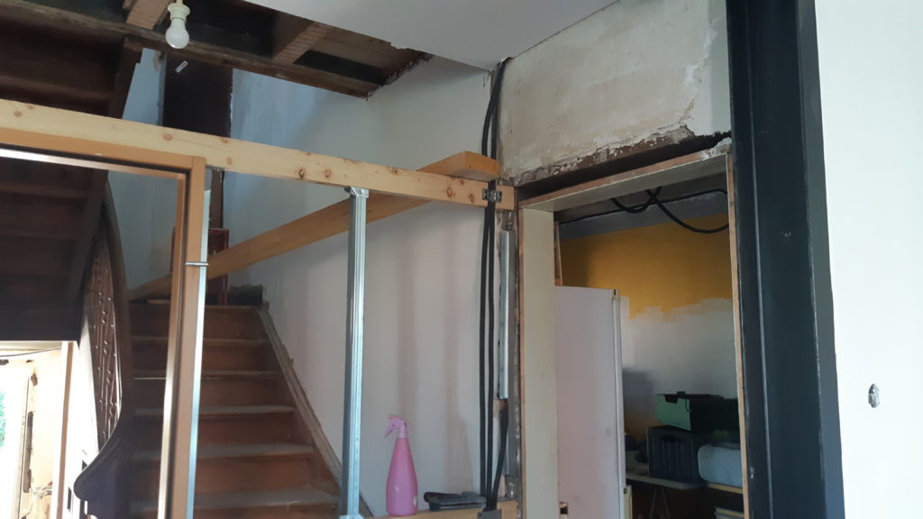 Enduit dans la cage d’escalier avec un échafaudage de fortune ! Plâtre au dessus de la porte de la cuisine de chantier pour boucher les trous. Restera à enduire.