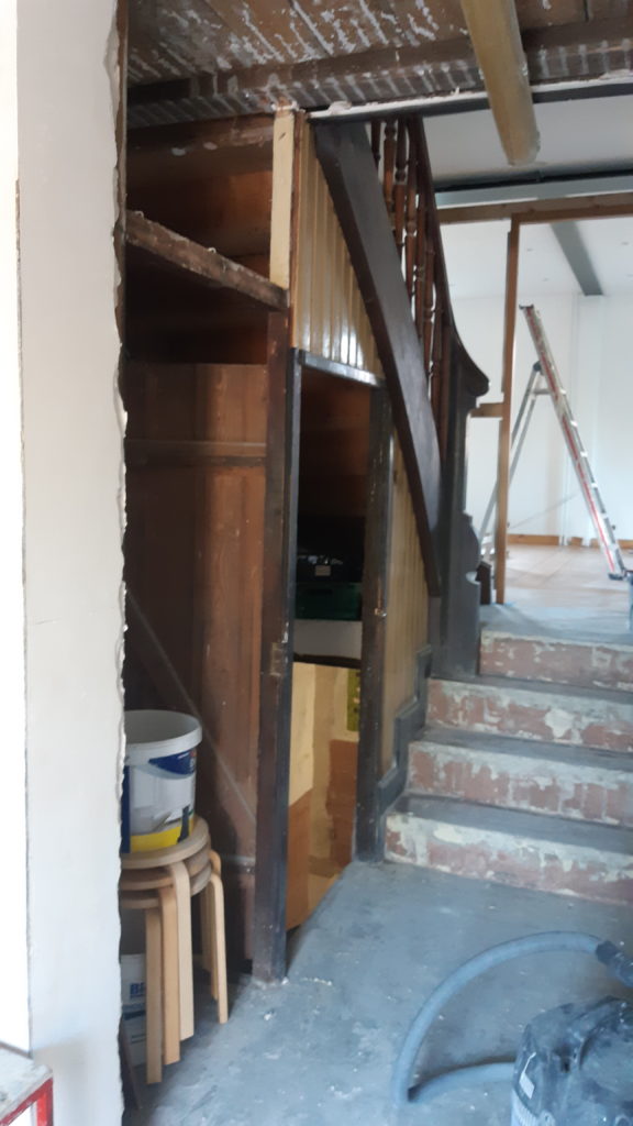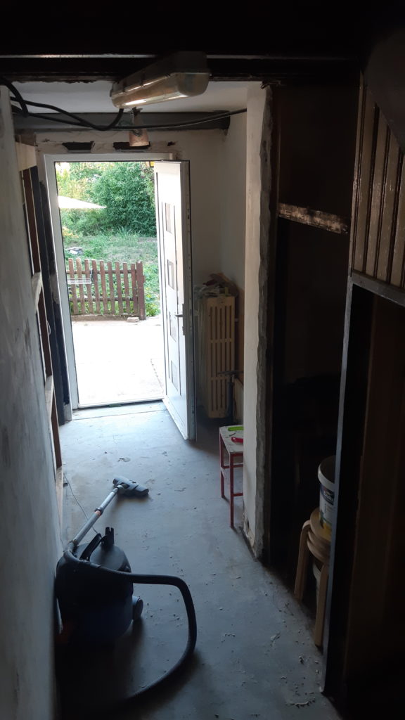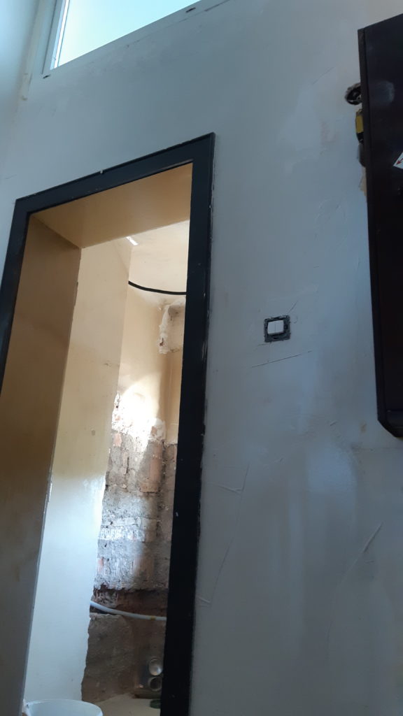 Démolition du placard de l’entrée, ménage et remplissage du Kangoo avec les déchets. Quelques raccordements électriques à refaire suite à la démolition car une boîte de raccordement était installée ici.