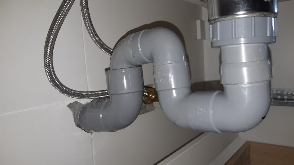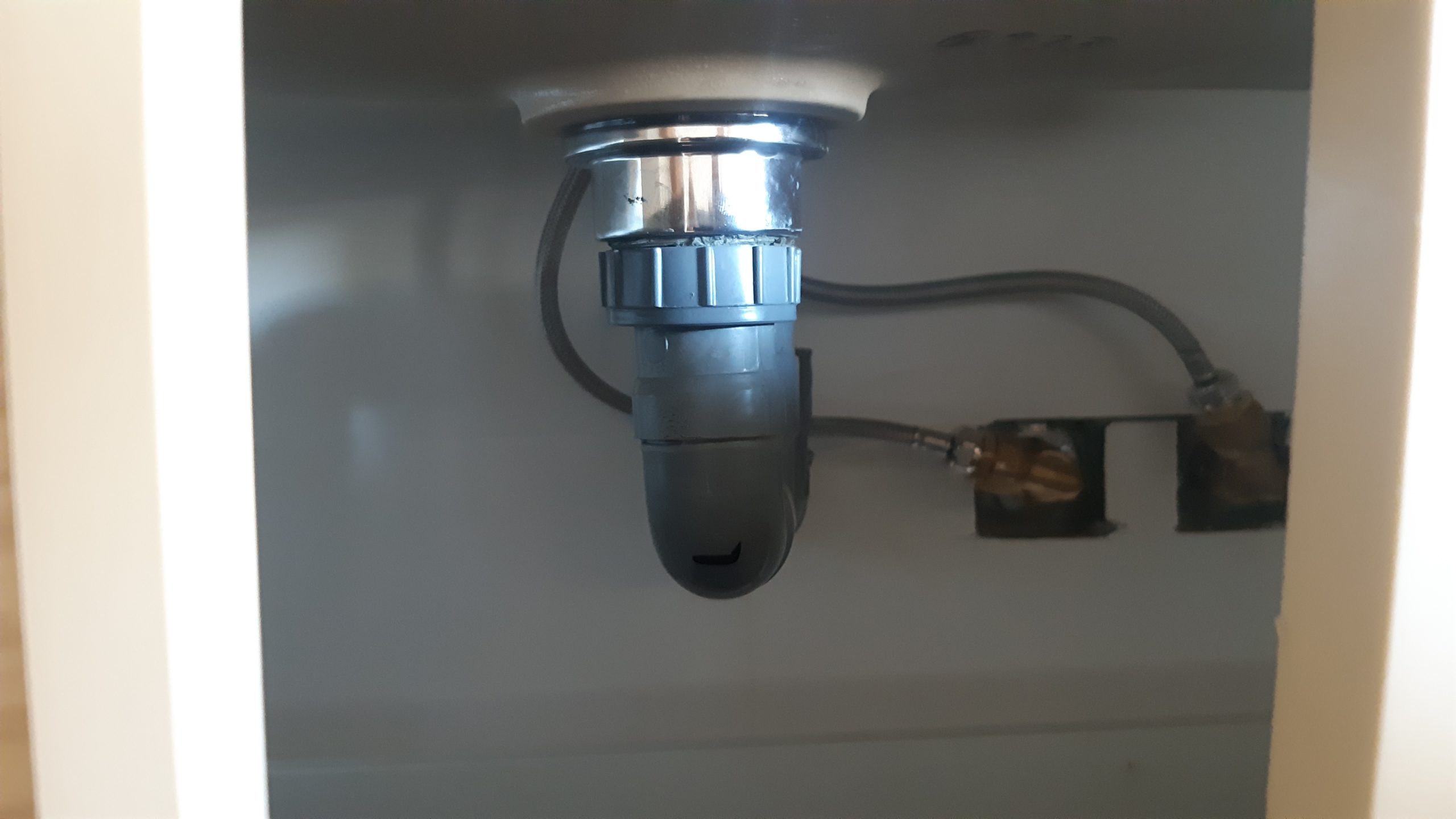 Passage chez LM pour acheter quelques bricoles pour finir l’évacuation d’eau du lavabo. Puis, installation du système. Quelques problèmes finalement, bricolage avec le décapeur thermique pour insérer une pièce de 32 femelle dans du 40 mâle. Ca marche ! Siphon faible encombrement terminé ! Découpage du tiroir de la chambre pour laisser la place au siphon