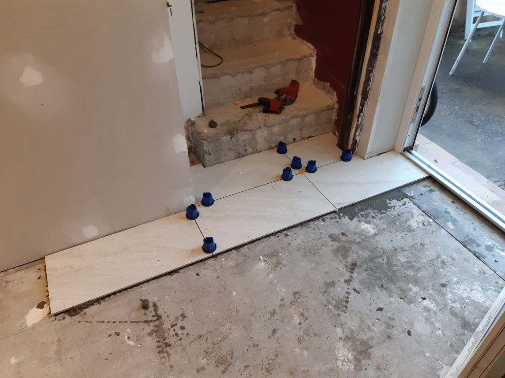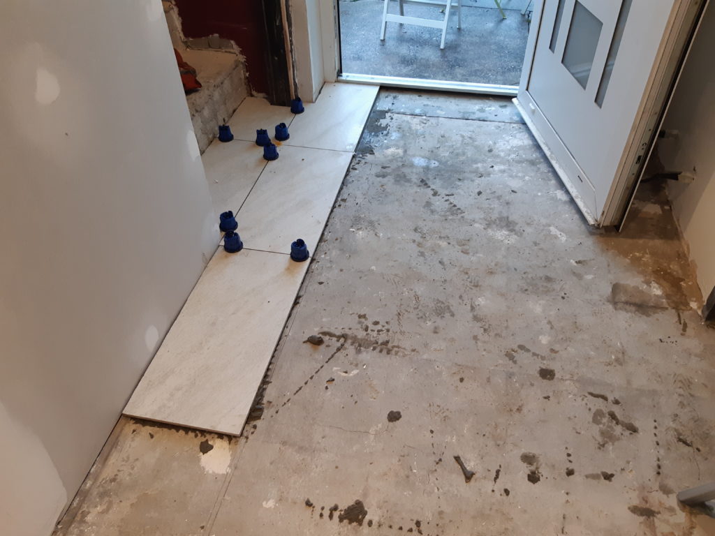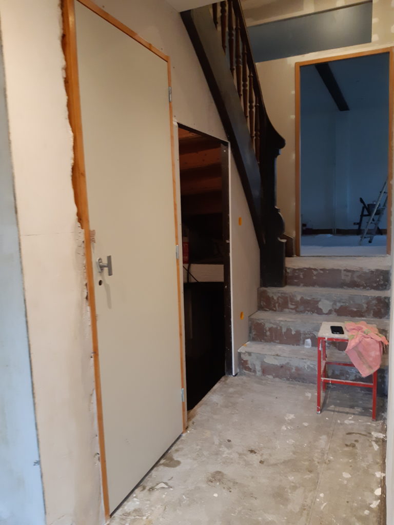 Plâtre autour de la porte du couloir et mise en place d’une couche de vitrificateur. Installation des boîtes électriques pour une prises et un interrupteur.