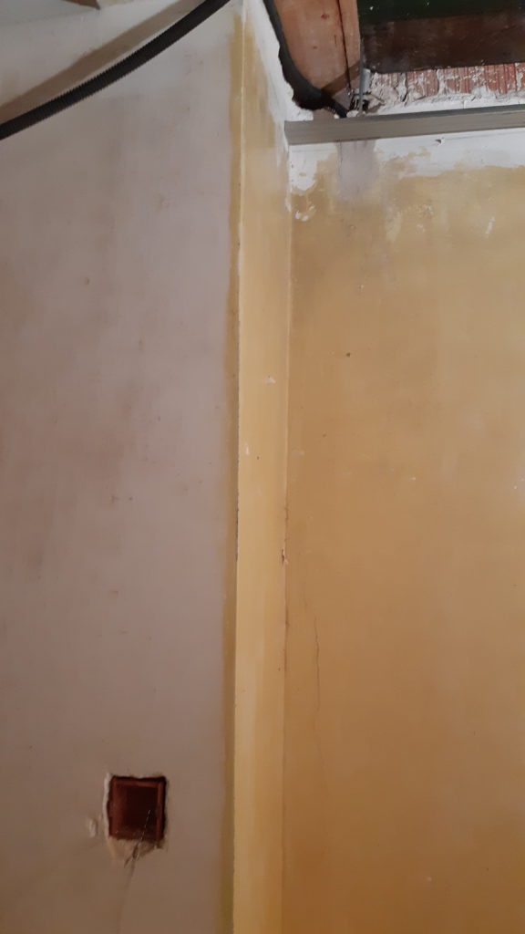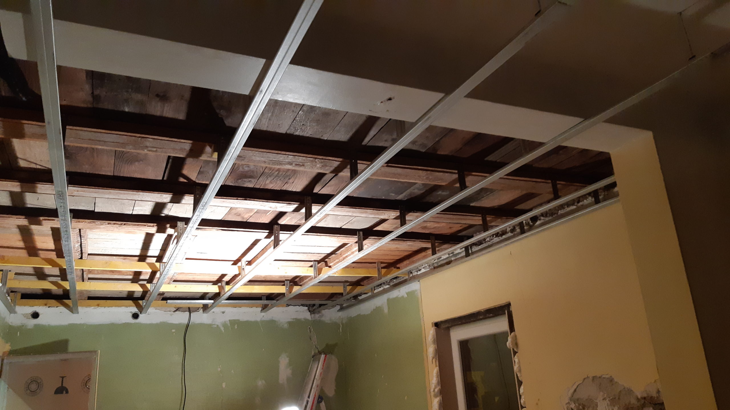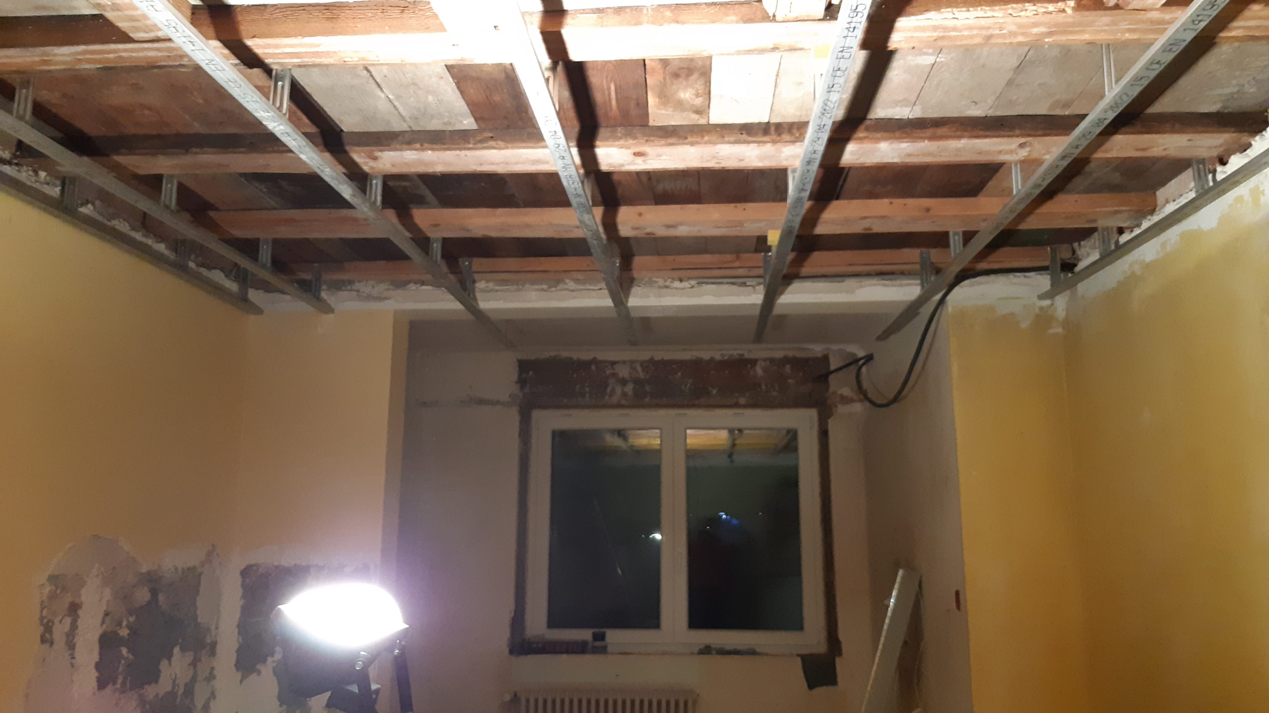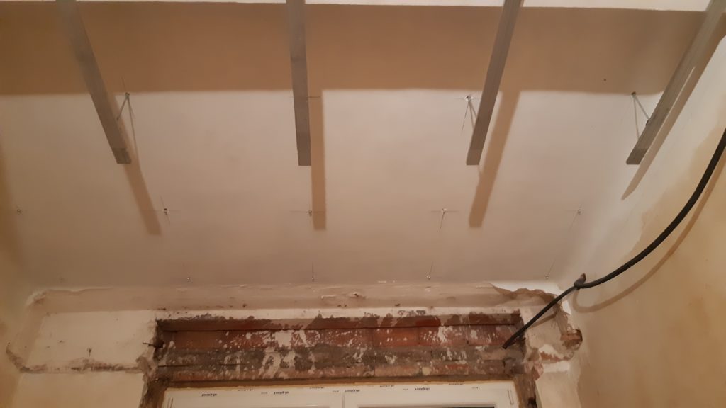 Mise en place des fourrures dans le bureau et un peu de plâtre pour fixer une gaine électrique. Perçage pour fixer les suspentes dans la partie béton