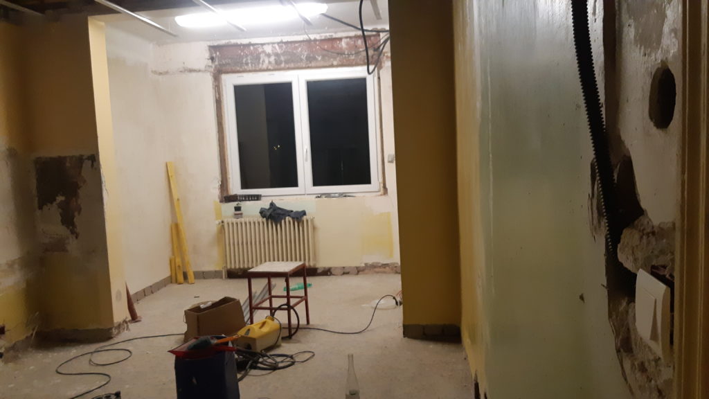 Installation des gaines électriques dans le bureau et passage des fils. Mise en place d’une lampe avec le va-et-vient