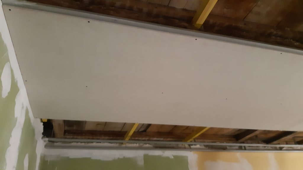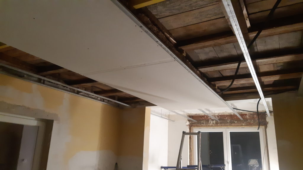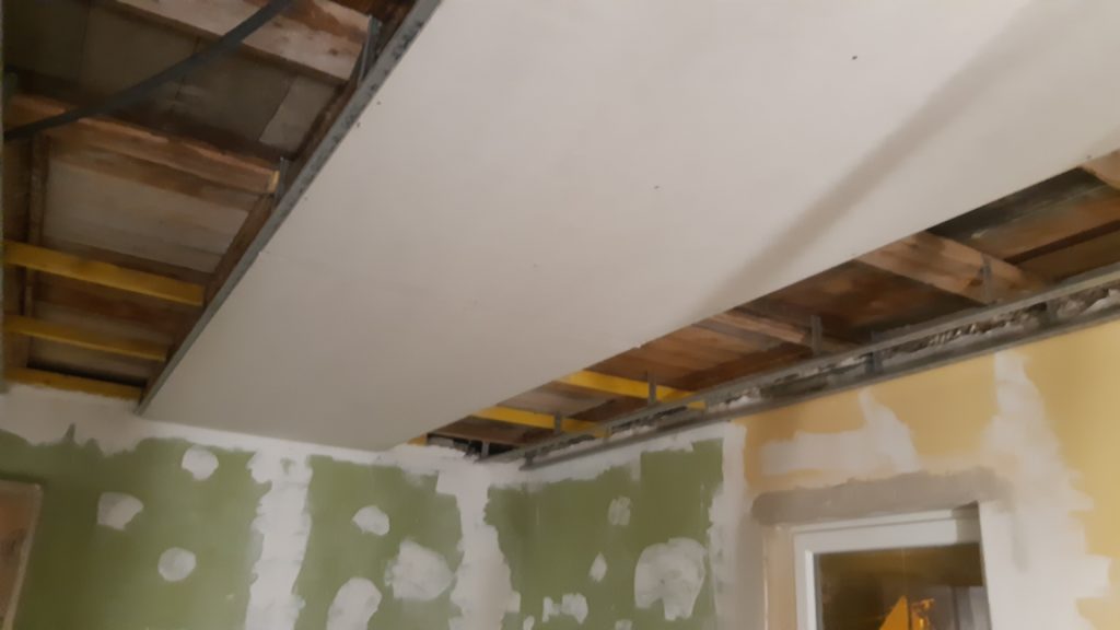 Mise en place des 2 premières plaques de plafond dans le bureau