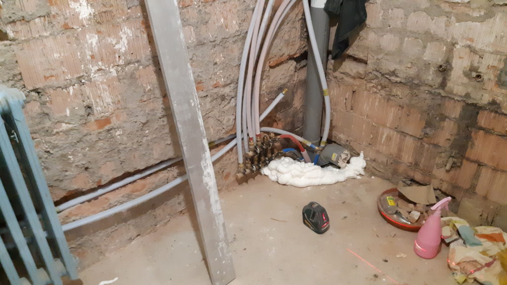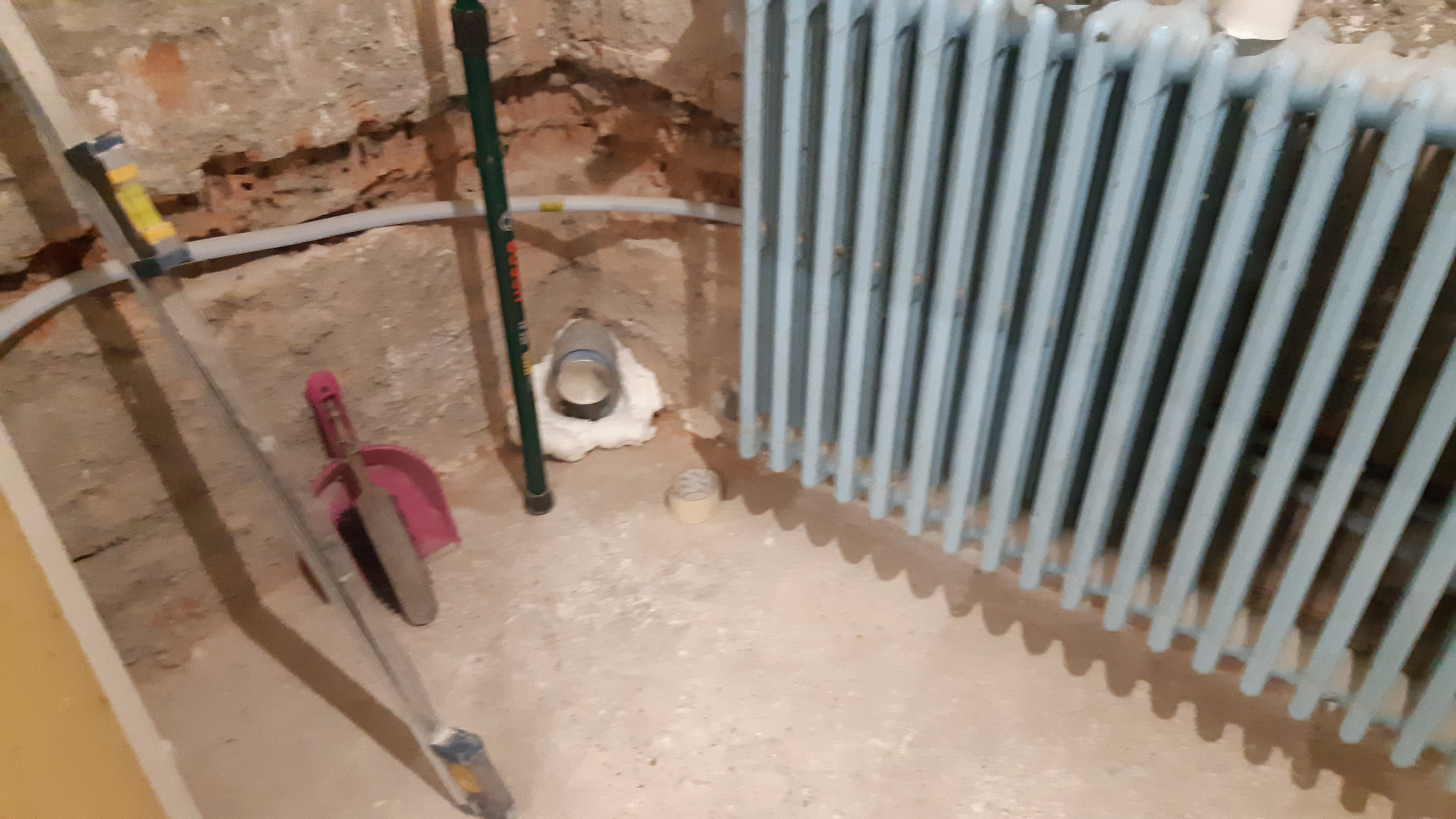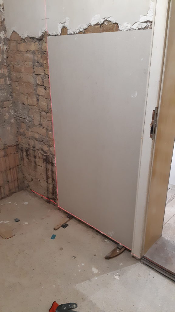 Préparatif au ragréage (bouchage des trous) dans la salle de bain et encollage d’une plaque de placo