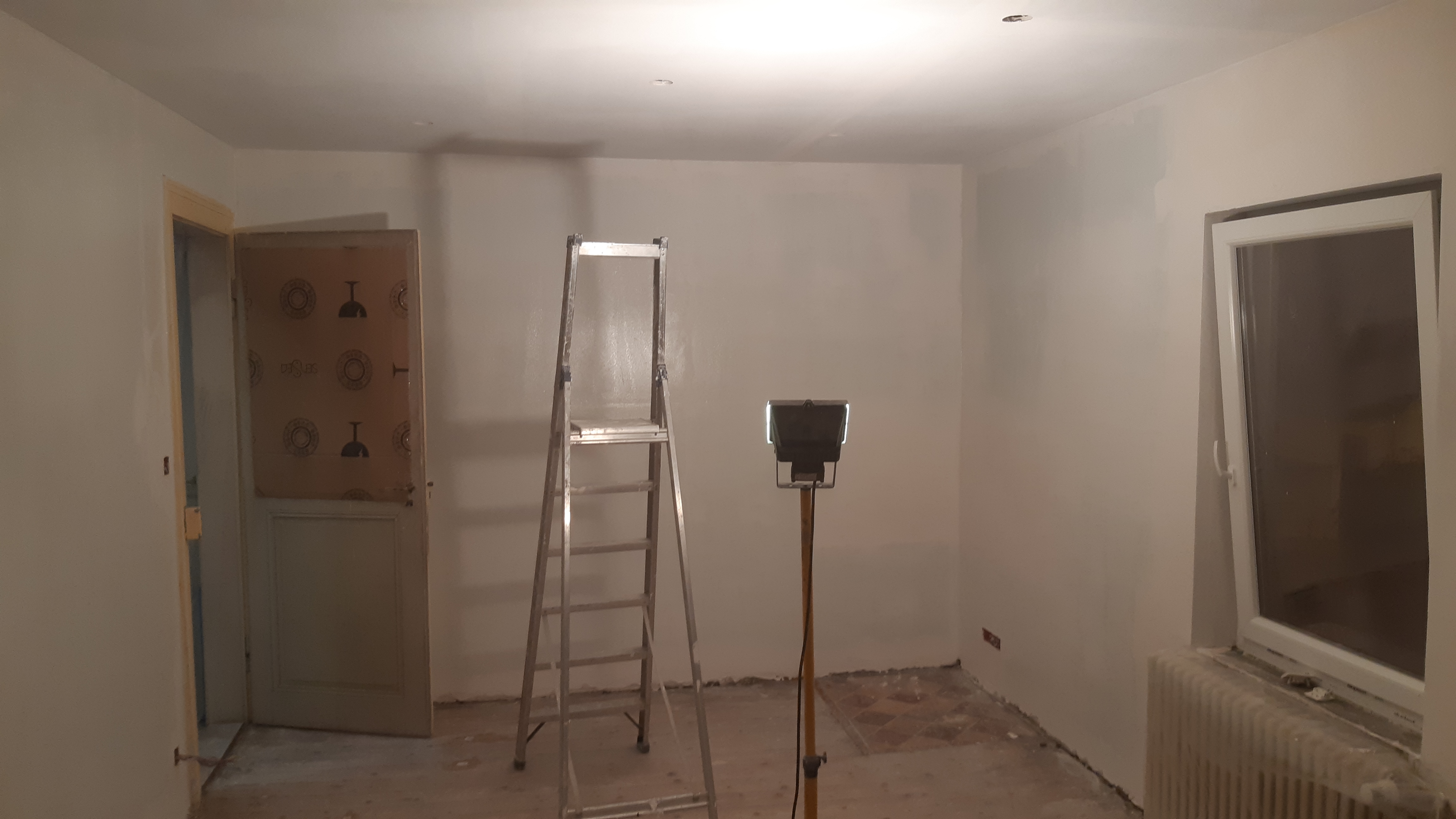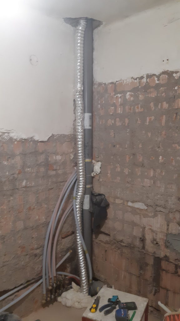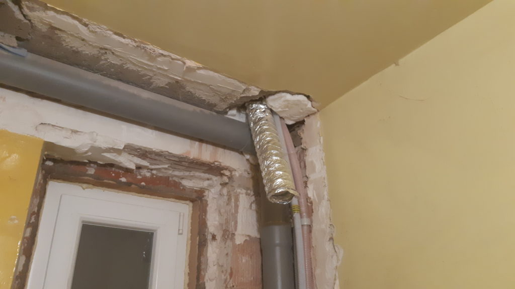 passage du tube de ventilation pour le WC par la salle de bain. Agrandissement du trou de l’évent d’égout