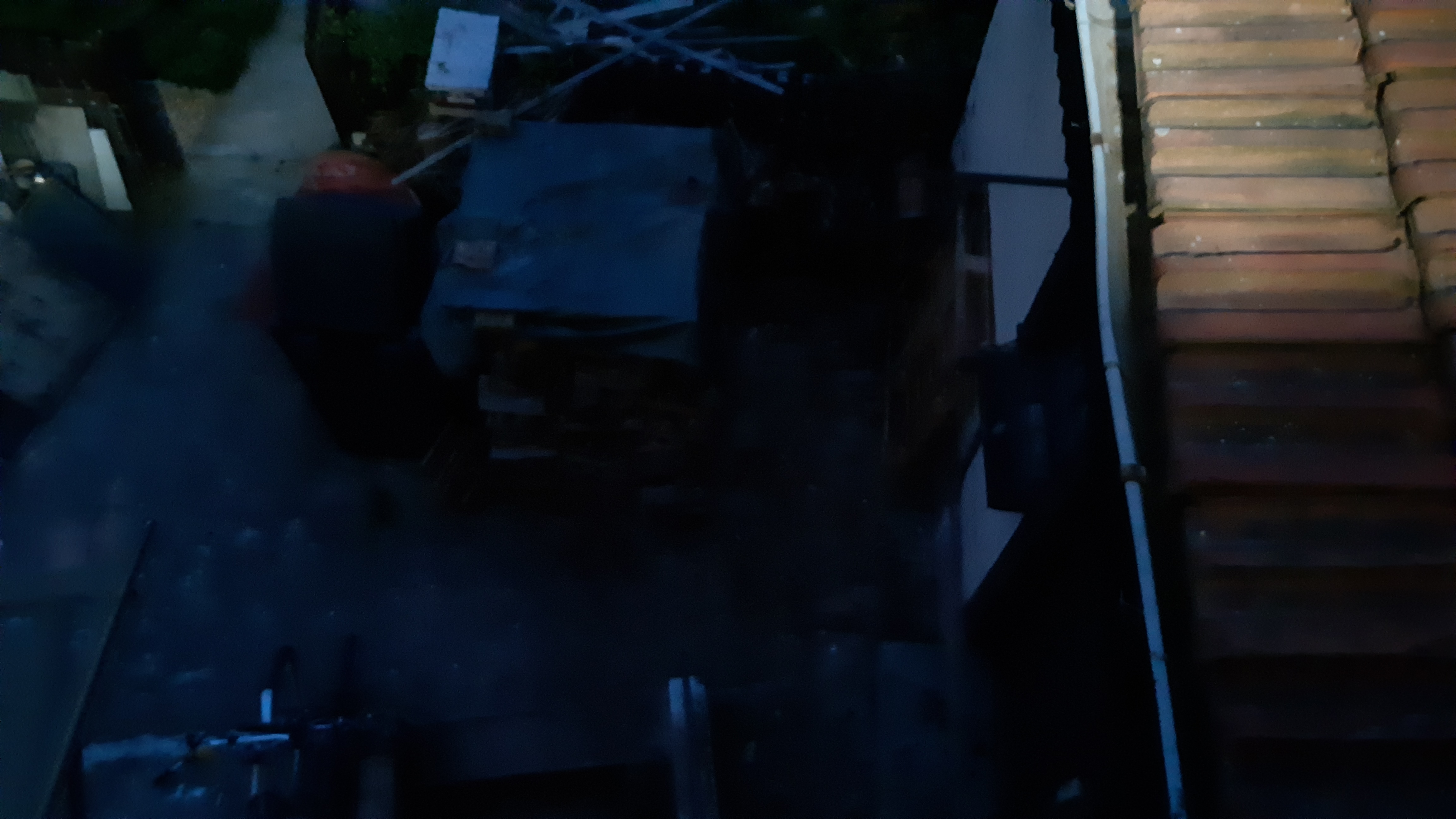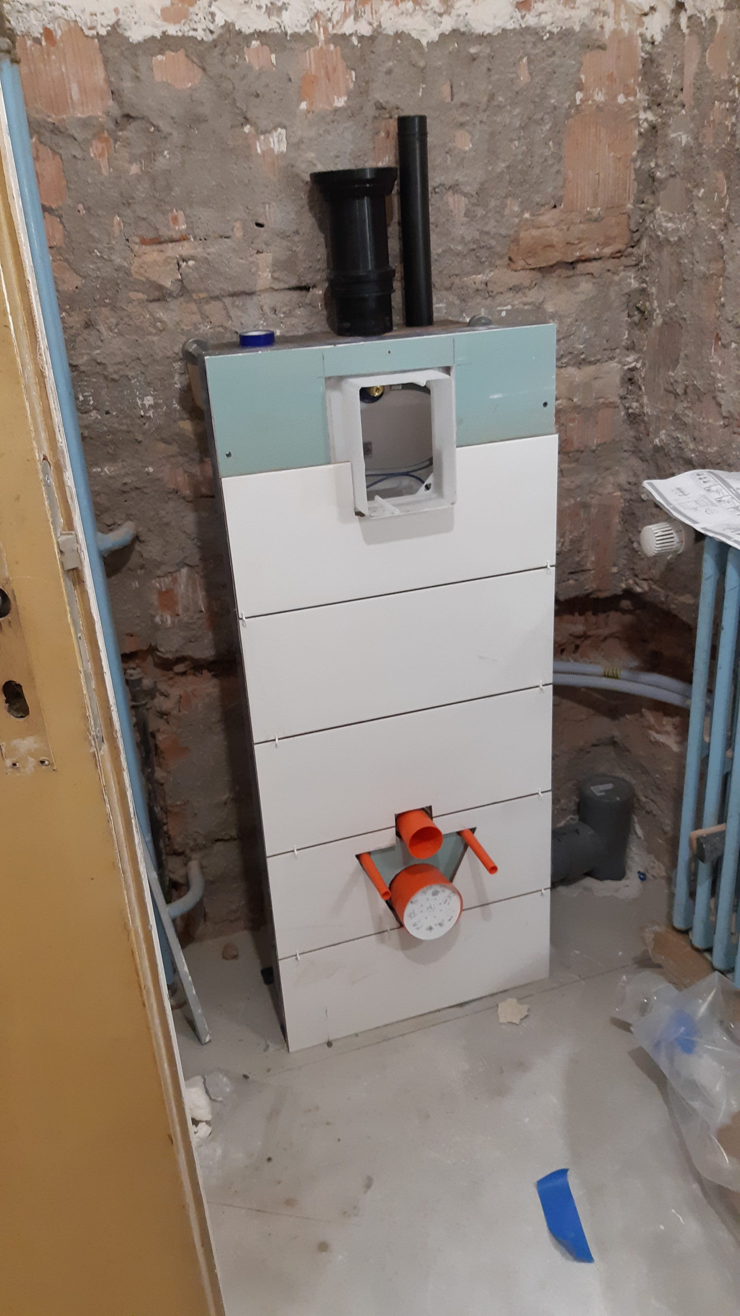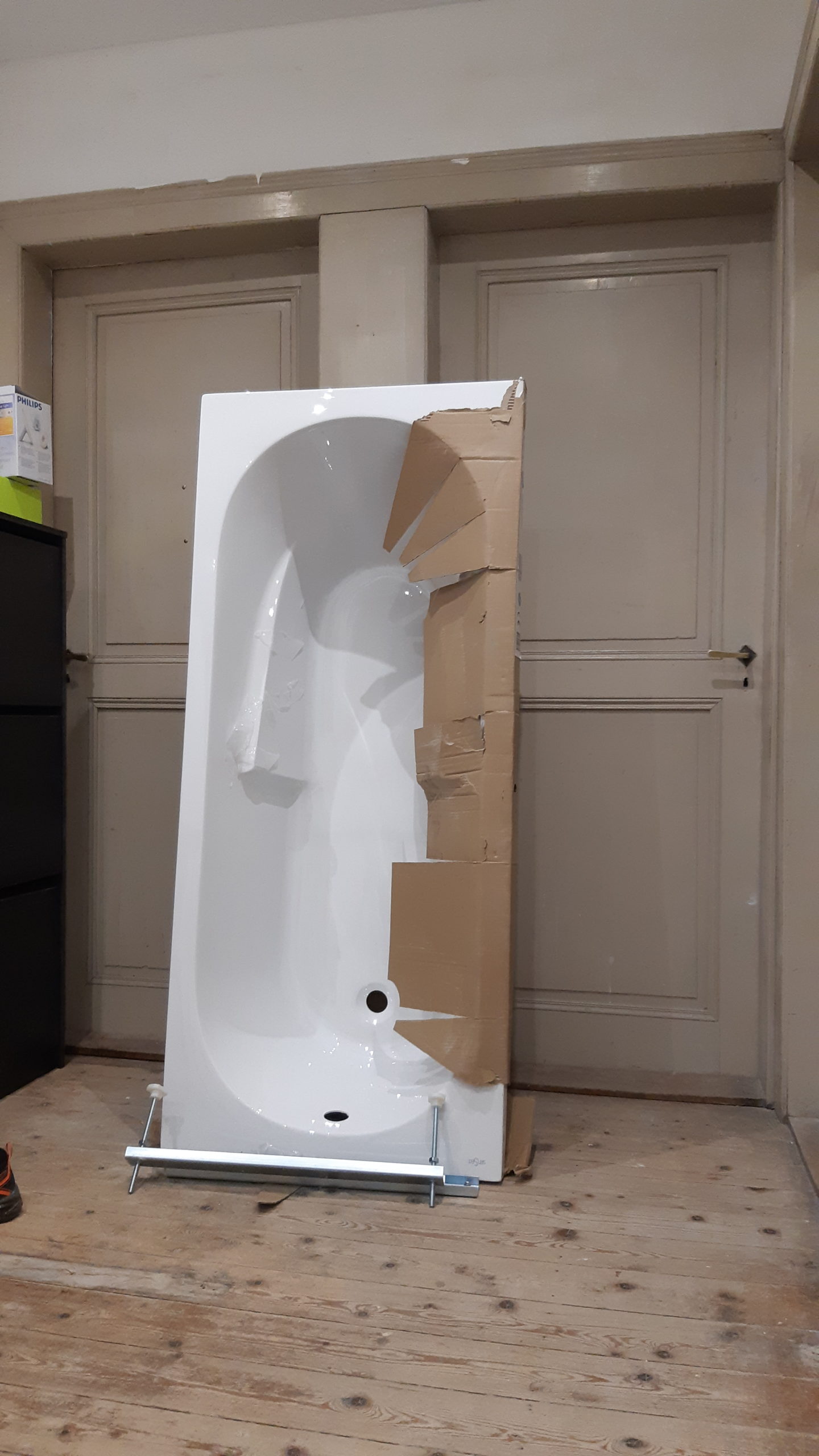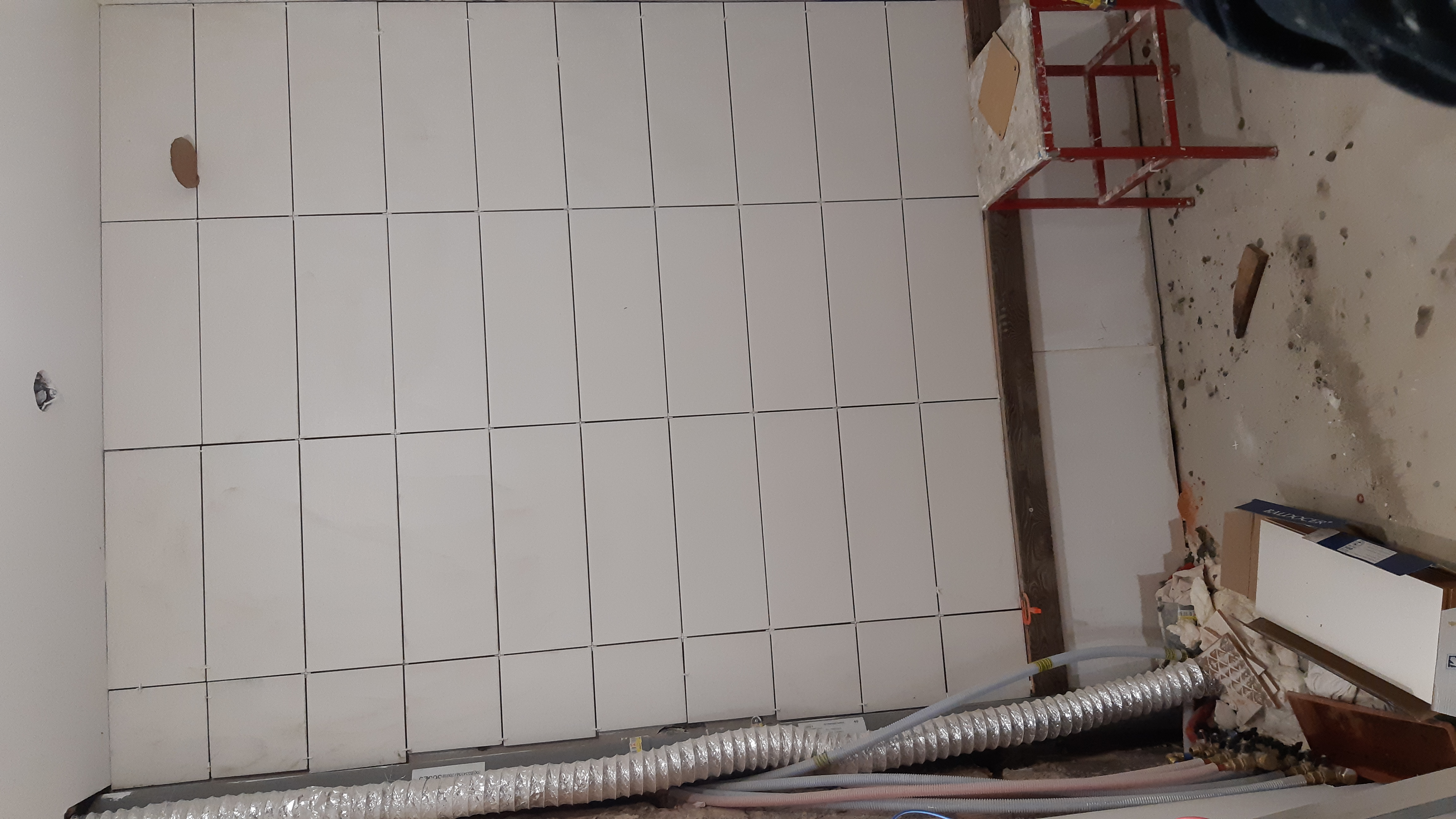 Carrelage dans la salle de bain, du côté du mur Ouest et sur le WC