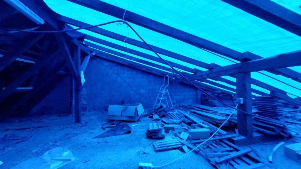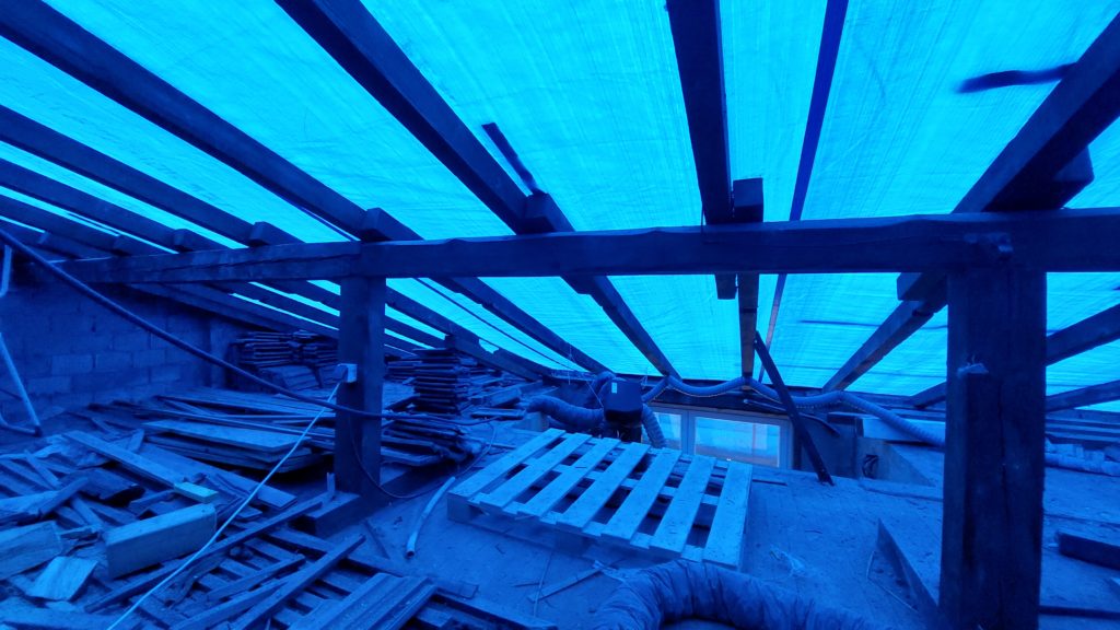 Retrait des tuiles du côté sud et installation de la bâche