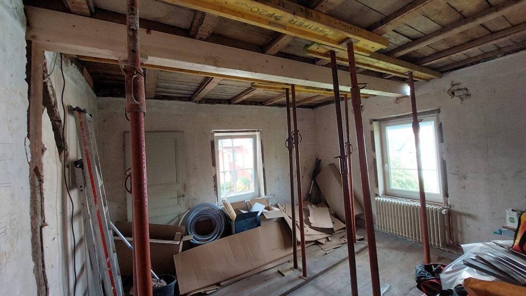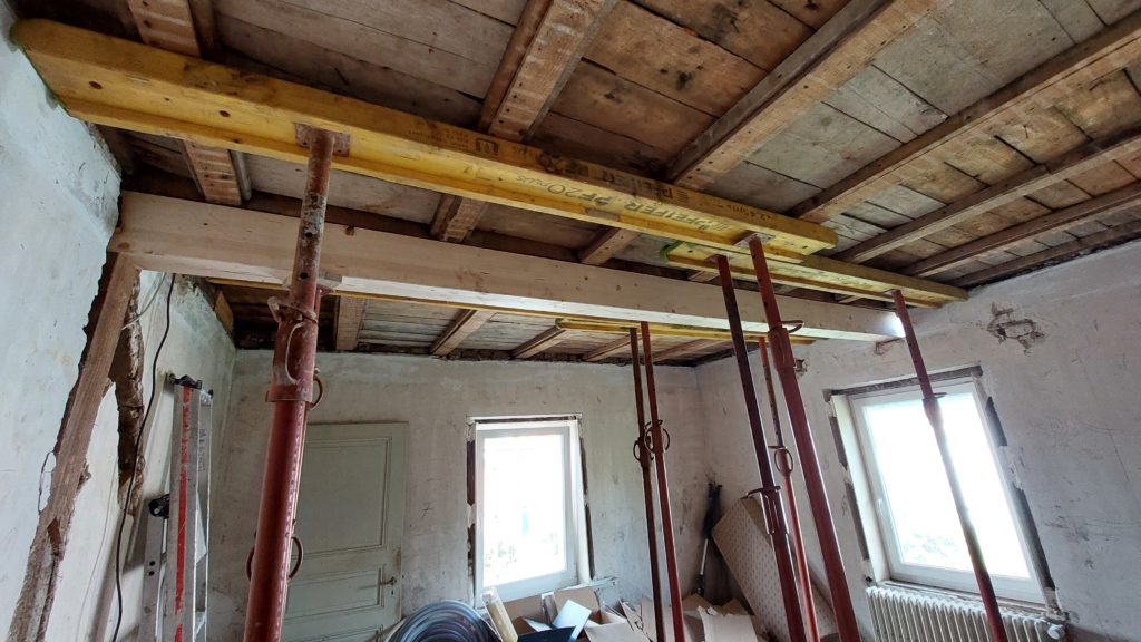 Mise en place d’un était sur solive pour redresser le plafond et le consolider avec une nouvelle poutre en lamellé-collé