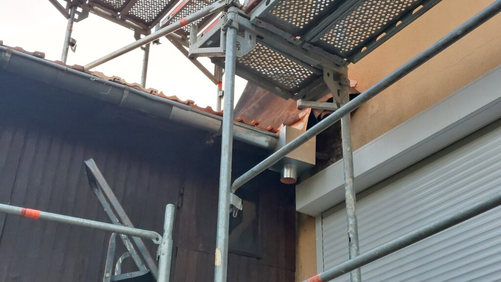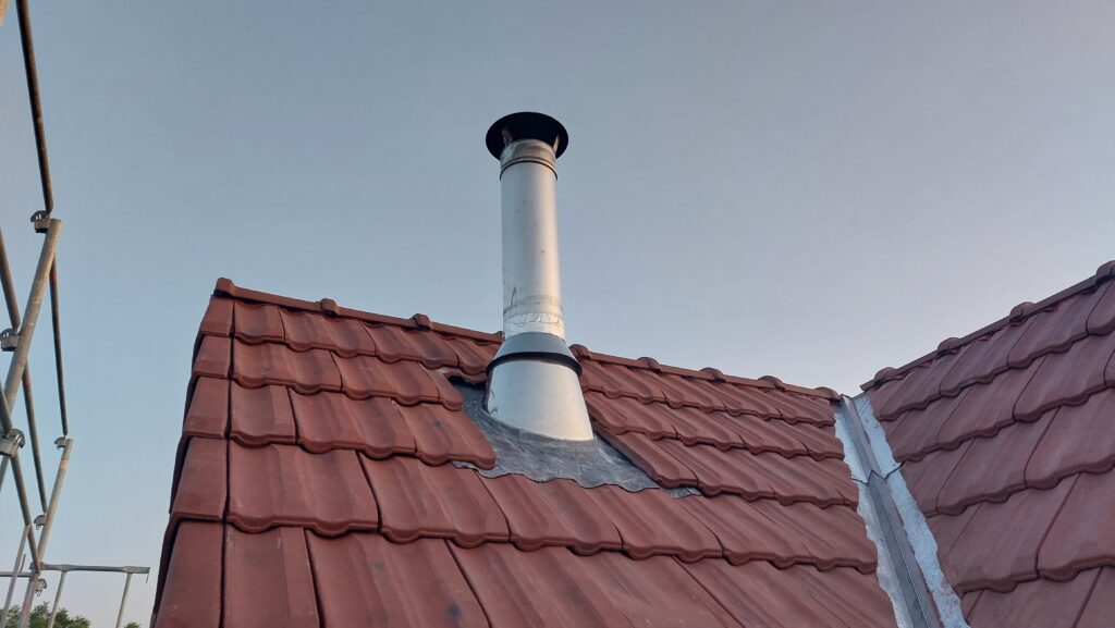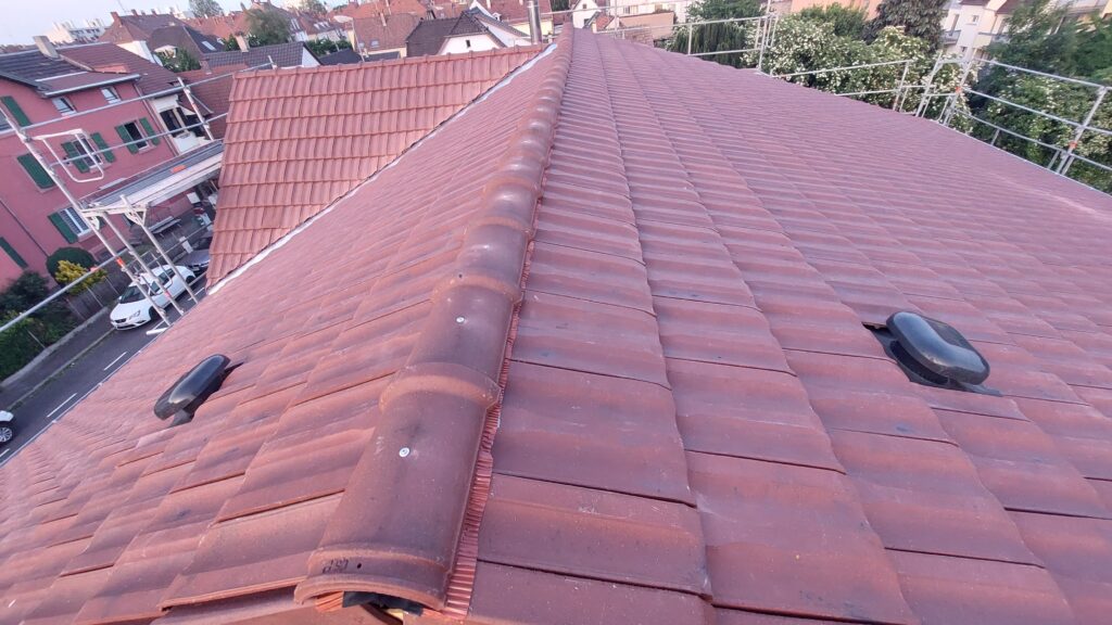 Installation des sorties de toiture, repositionnement des tuiles faitières, repositionnement de la sortie de cheminée et mise en place d’un scotch argenté sur la cheminée pour finir proprement.