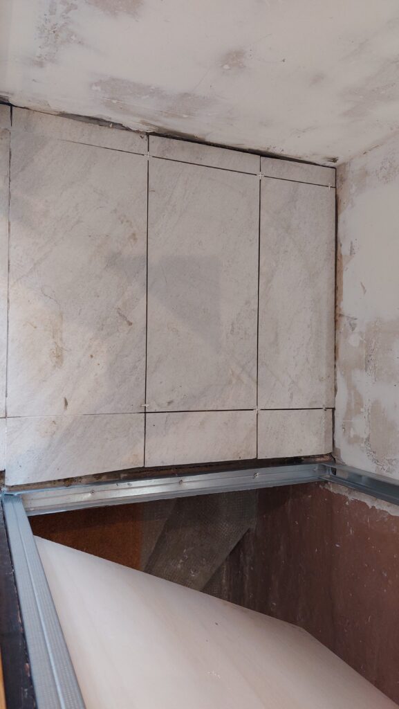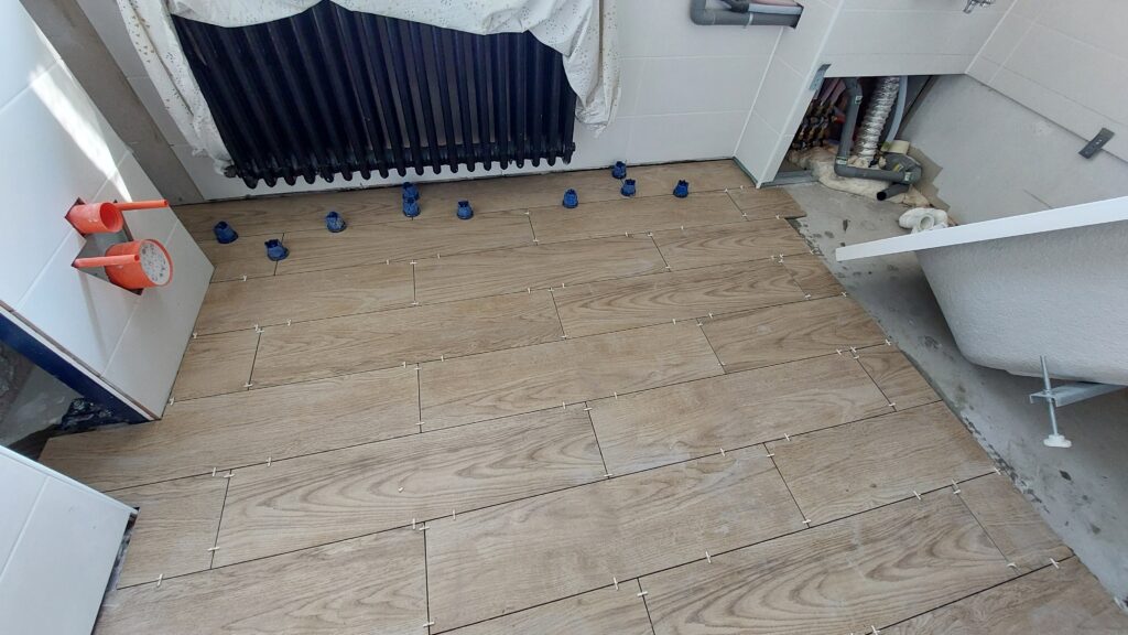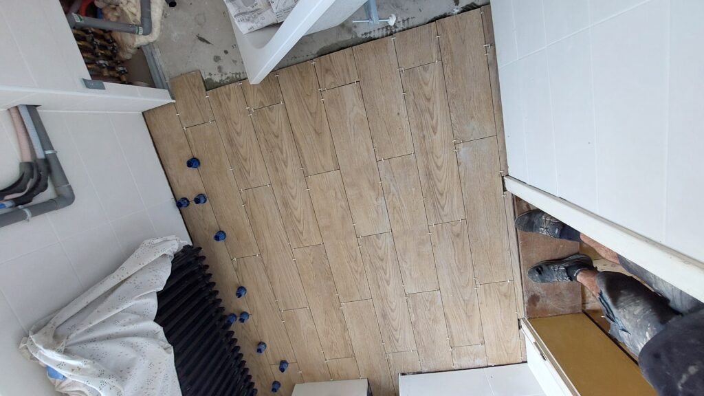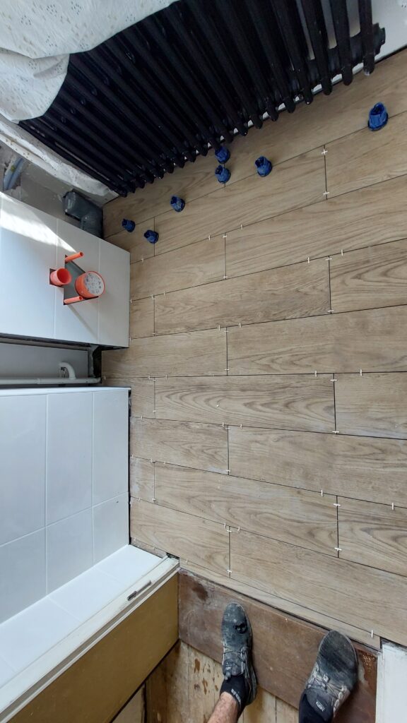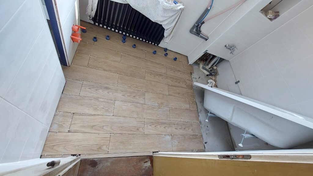 Mise en place du carrelage au sol dans la salle de bain et finalisation de quelques carreaux dans le placard du rez-de-chaussée de chaussée