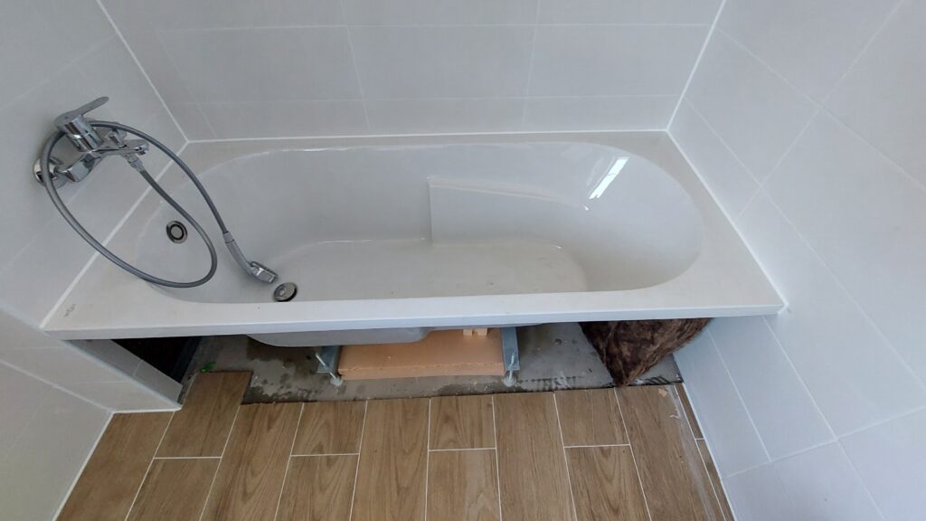 Joint et silicone dans la salle de bain. Installation de la baignoire avec le silicone d’étanchéité
