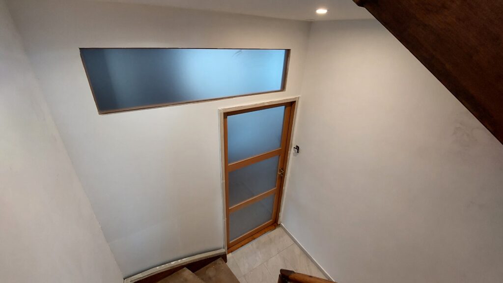 Finalisation de la peinture de la porte de la salle de bain et 2eme couche sur les murs du paliers de l’escalier du rdc