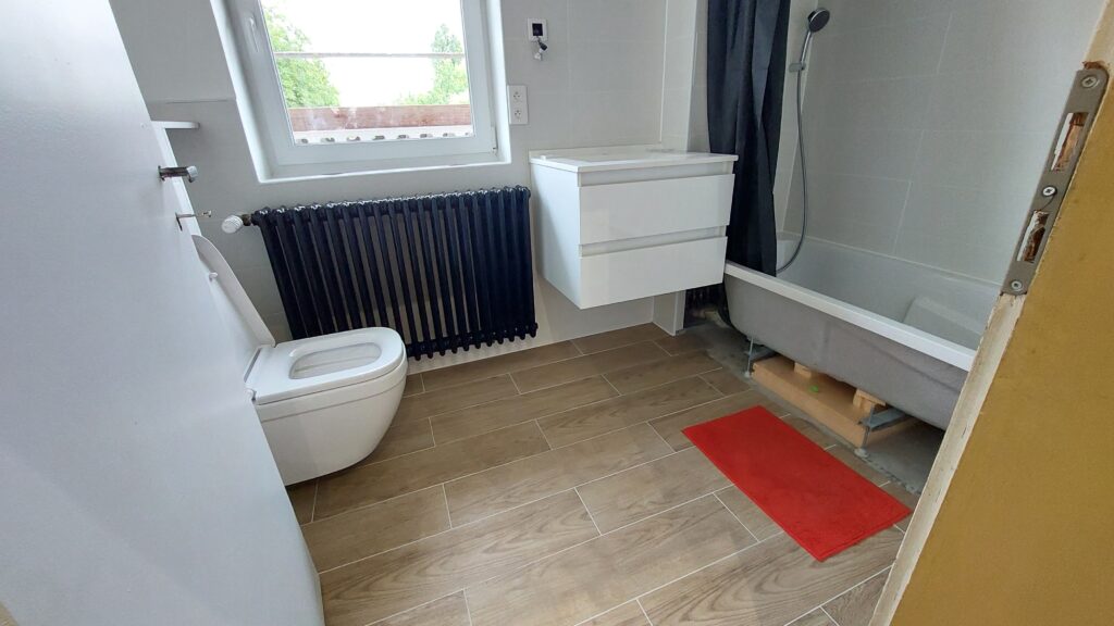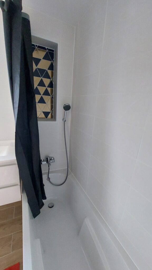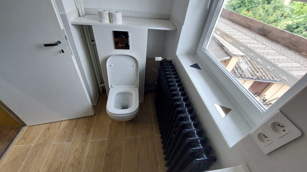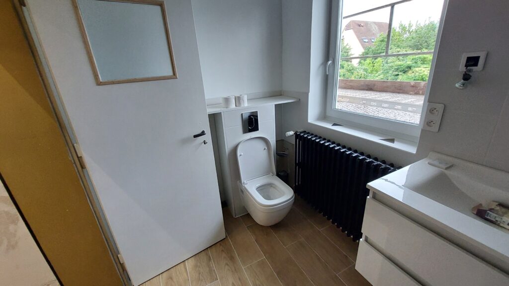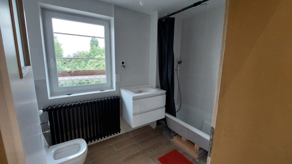 Quelques finitions et installation des WC et du lavabo dans la salle de bain ainsi que du rideau de douche de dépannage. Installation de bouche de ventilation et gros ménage du sol au plafond