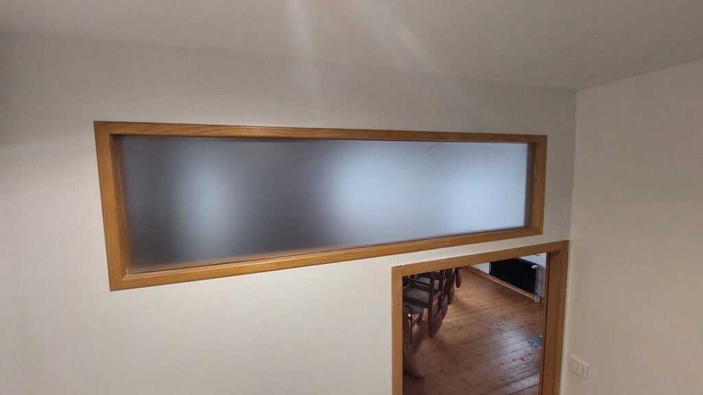 Installation de l’encadrement de la fenêtre intérieure entre le salon et l’escalier