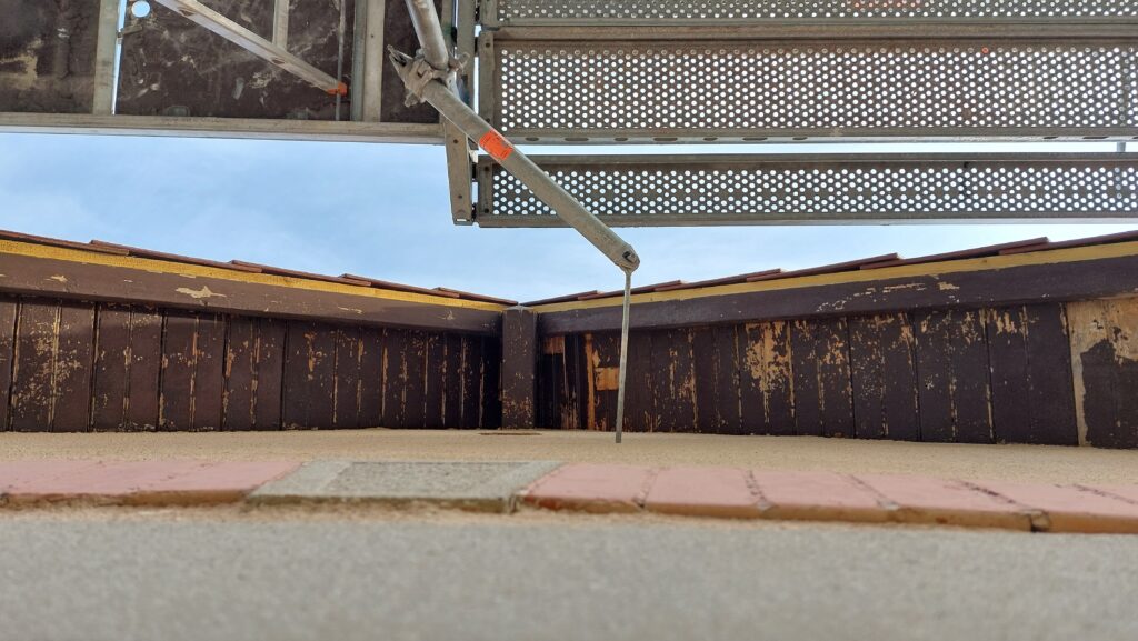 Passage de la brosse métallique sur les anciennes peintures des lambris de toiture
