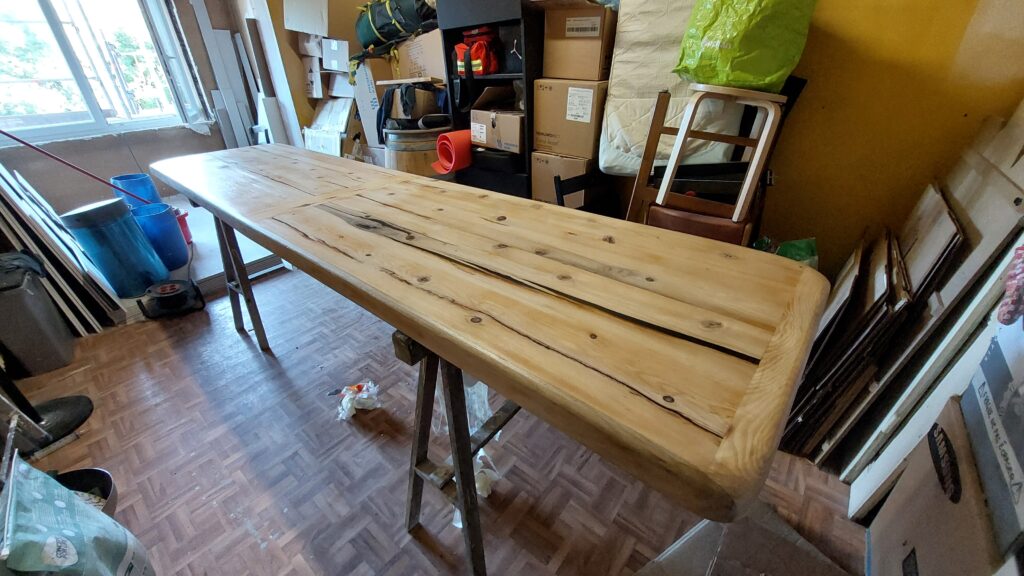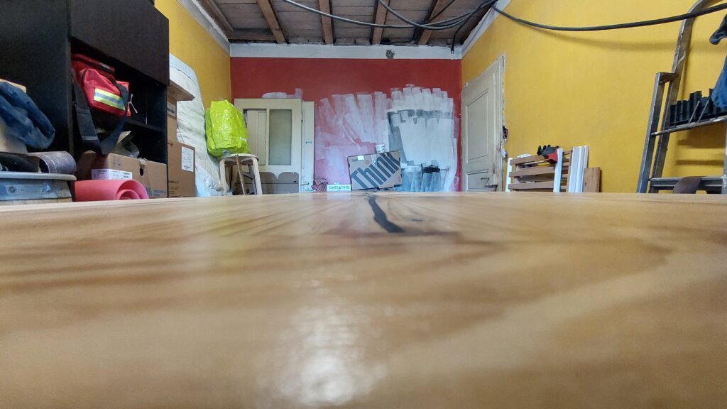 Déménagement des lattes de bois devant la maison pour laisser de la place au chantier