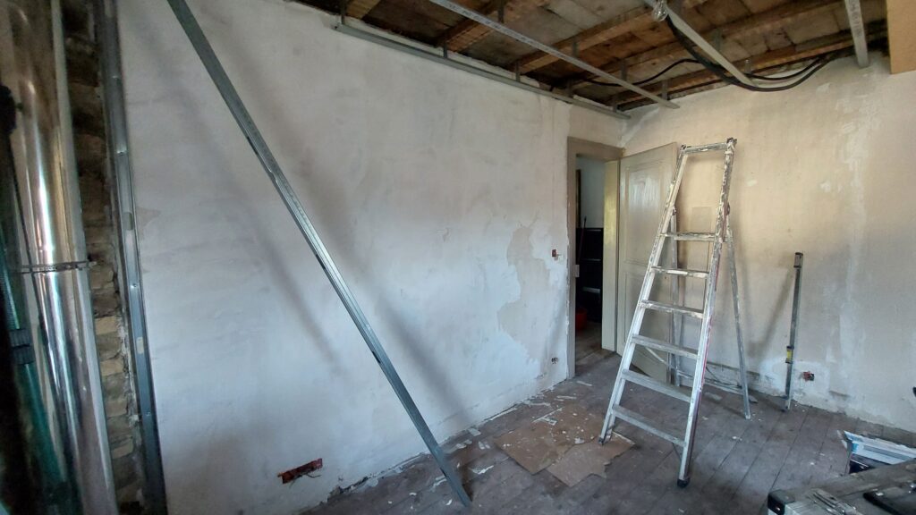 Pose de l’enduit sur le murs sud de la chambre rouge