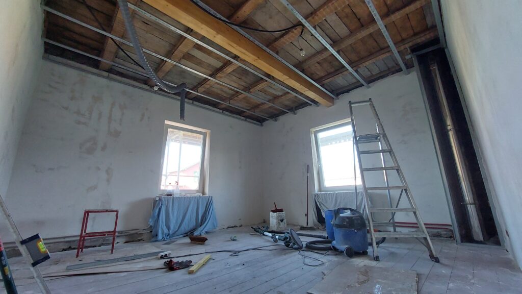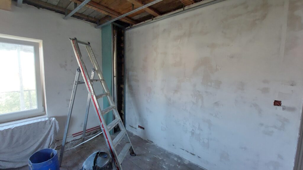 mise en place des derniers rails à placo du plafond et ponçage des murs dans la chambre à l’est.