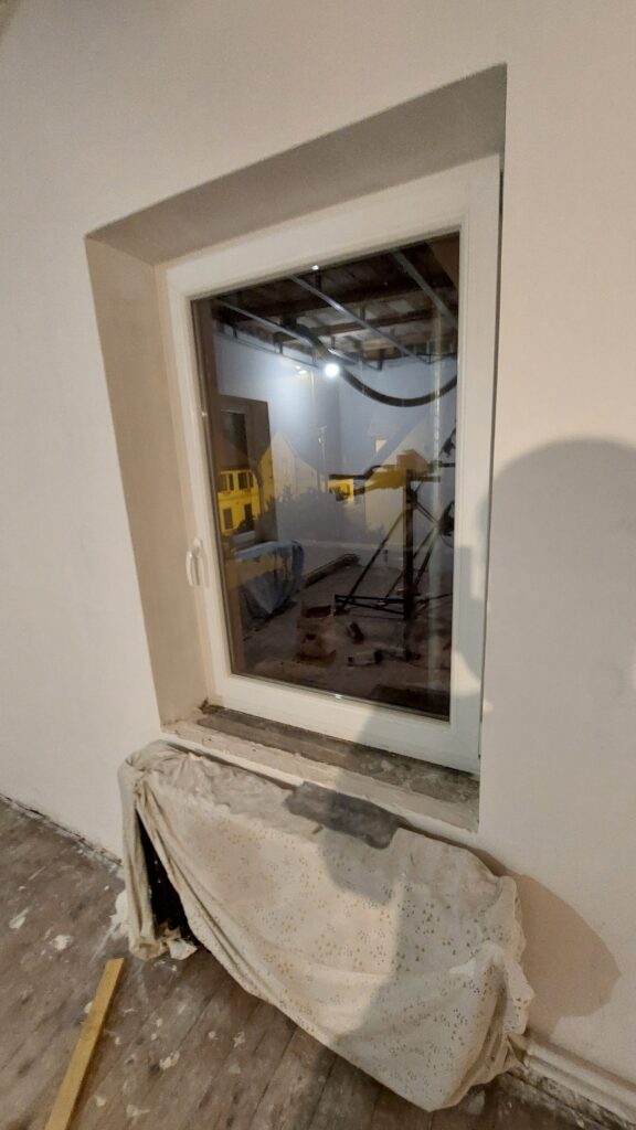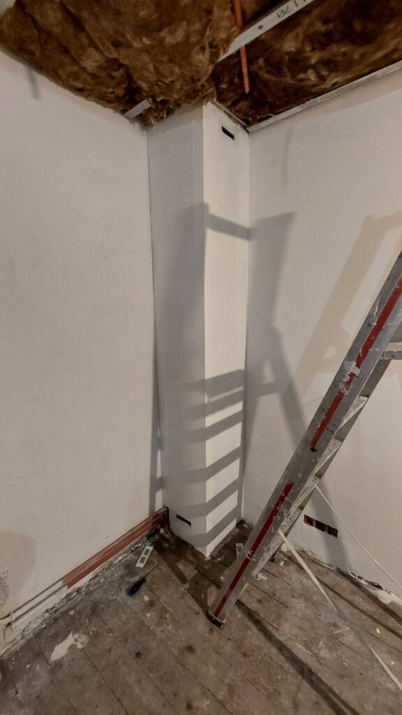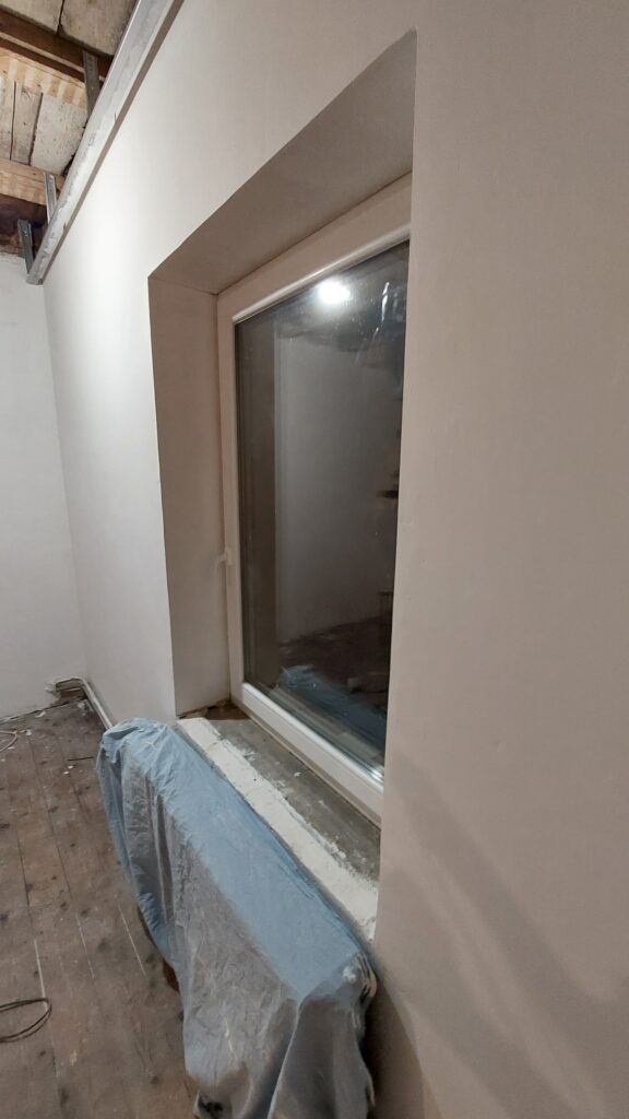 Sous-couche de peinture dans la chambre de droite sur les tours de fenêtres et le caisson du tuyau poêle