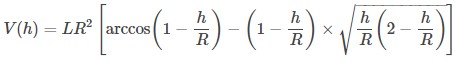 V = L * R * R * (math.acos(1-(h/R))-(1-h/R)*math.sqrt(h/R*(2-h/R)))