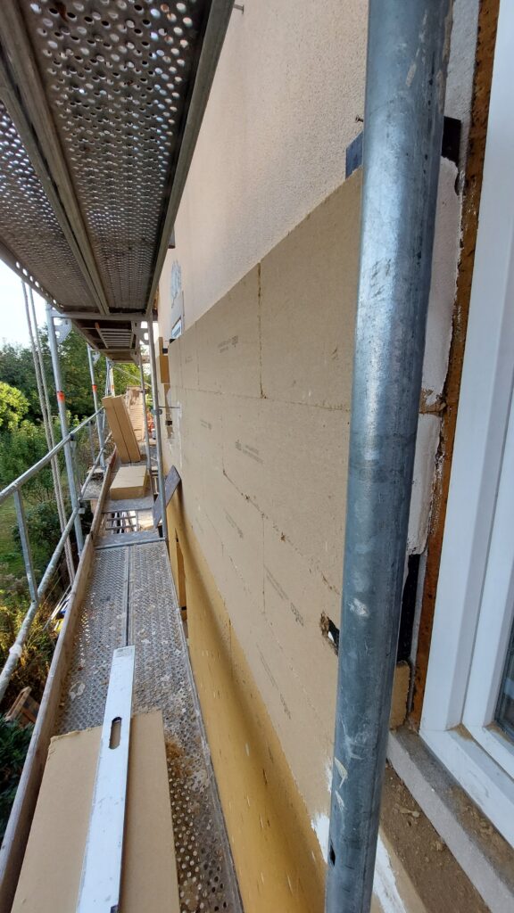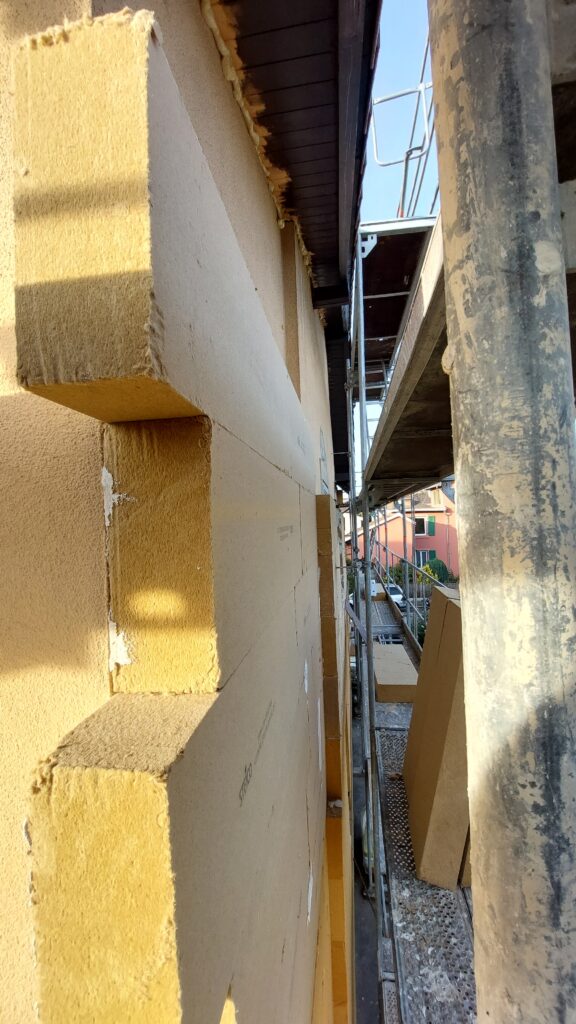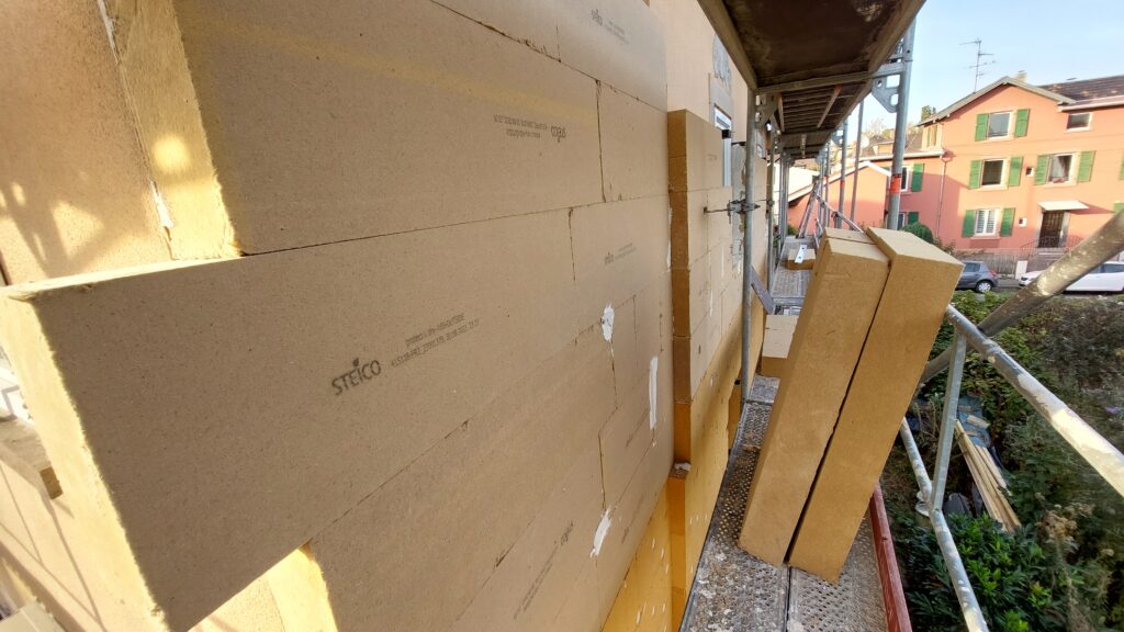 Reprise des travaux de façade et d’isolation. Installation de 4 rangées sur le mur Est.