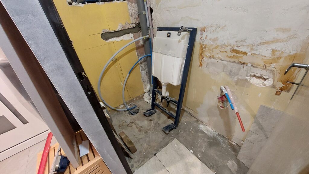 Rénovation des WC du RDC. Retrait du WC, démontage du cadre, agrandissement du trou d’évacuation pour décaler le WC vers la fenêtre le plus possible. Plâtre dans les trous. Bétonnage de l’ancien trou d’arrivée de la chasse d’eau. Sera rebouché par du plâtre ensuite.