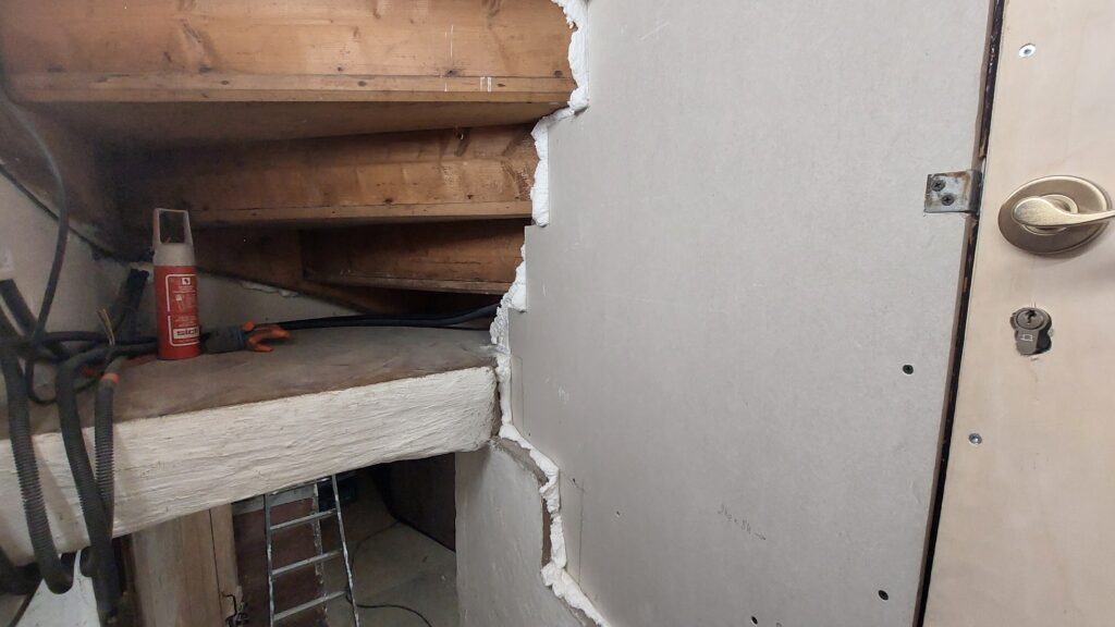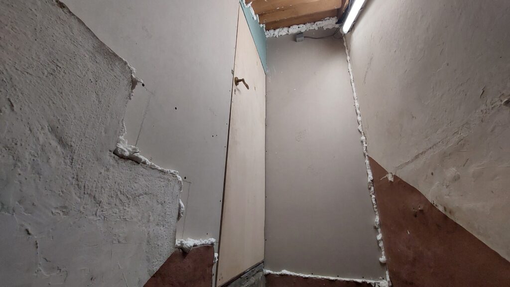 Placo dans la cage d’escalier de la cave pour tout isoler, mise en place de la mousse expansive pour boucher les derniers trou. Mise en place d’un boite electrique pour la sonnette.