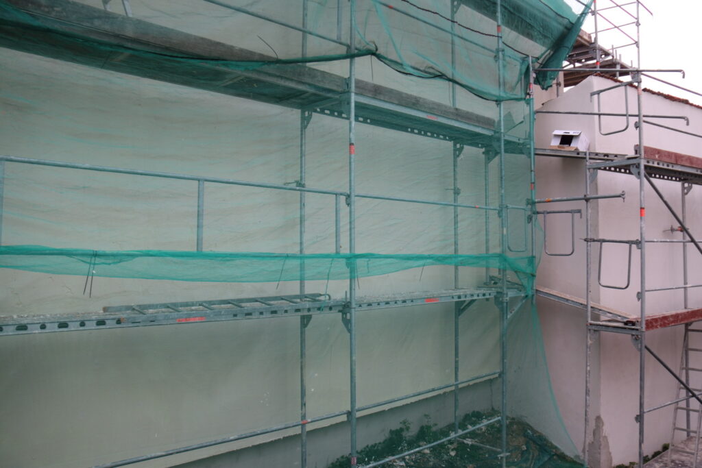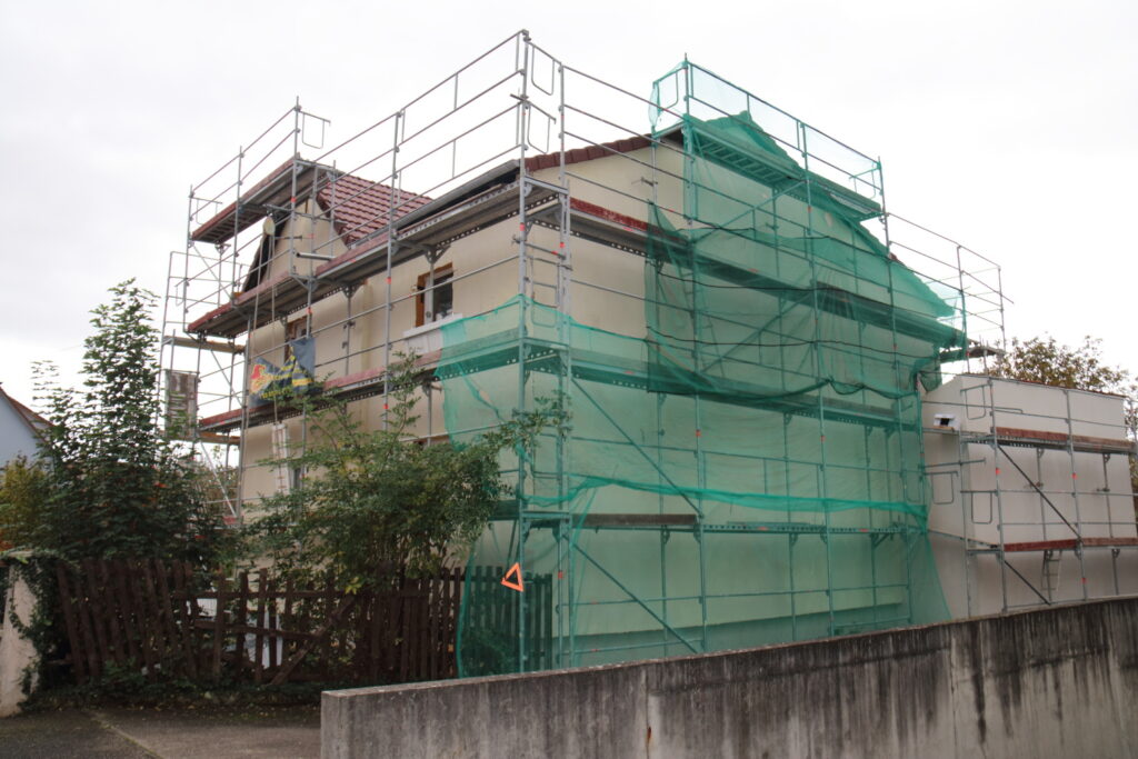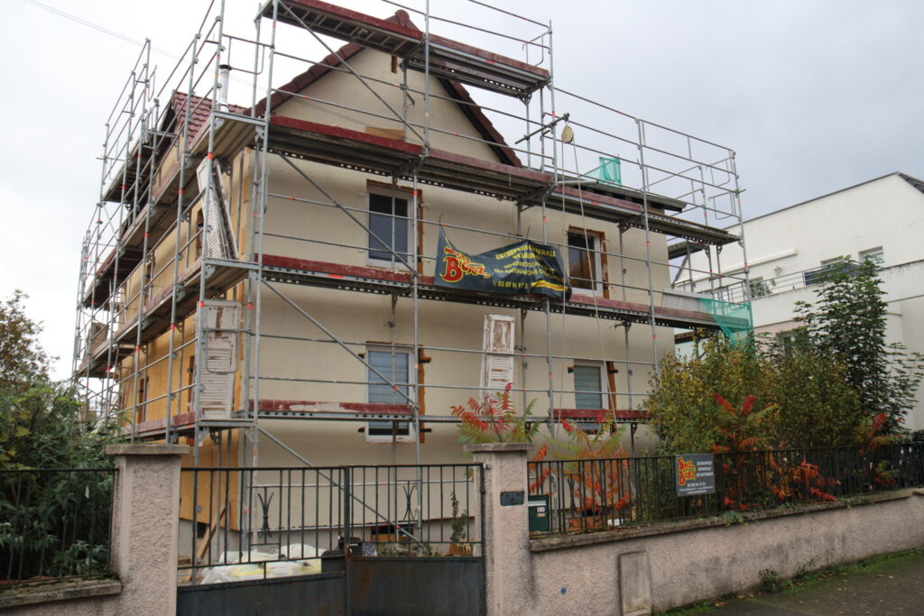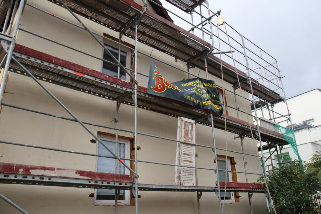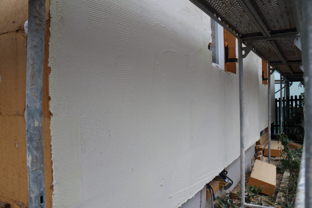 Pose de la couche crantée sur les façades Nord et Est par l’entreprise. Changement de couleur de la maison du jaune/brun au gris