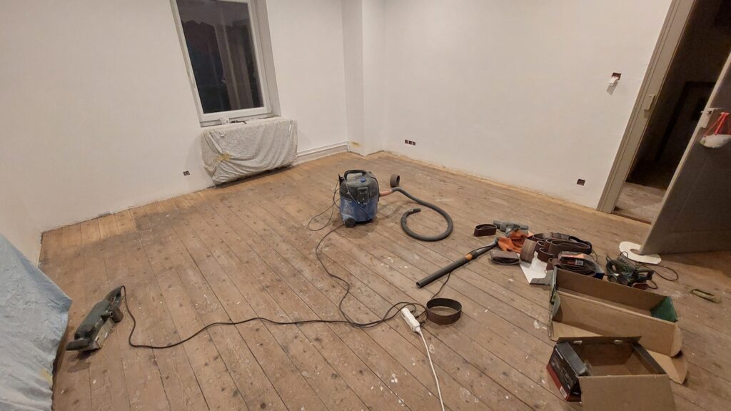 Début du ponçage du sol de la chambre Nord Est.