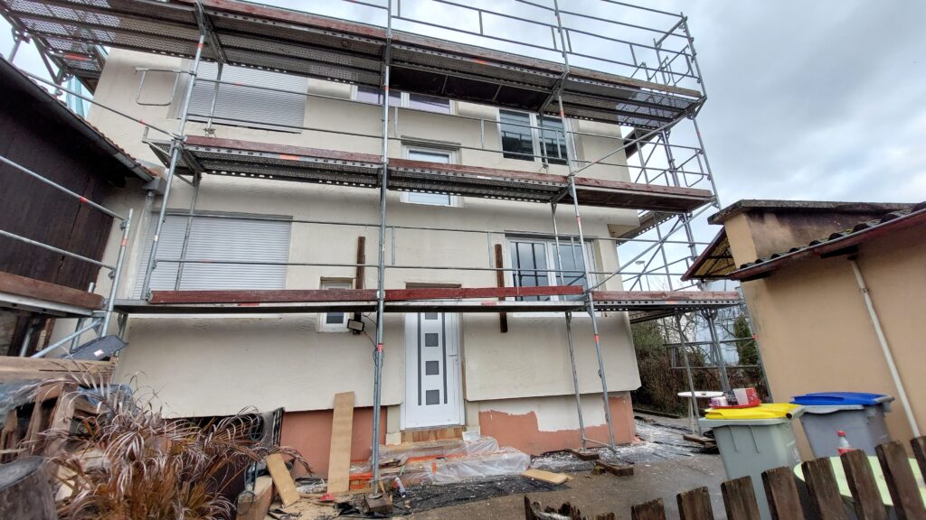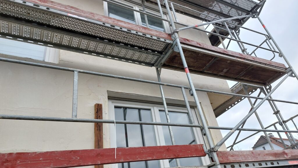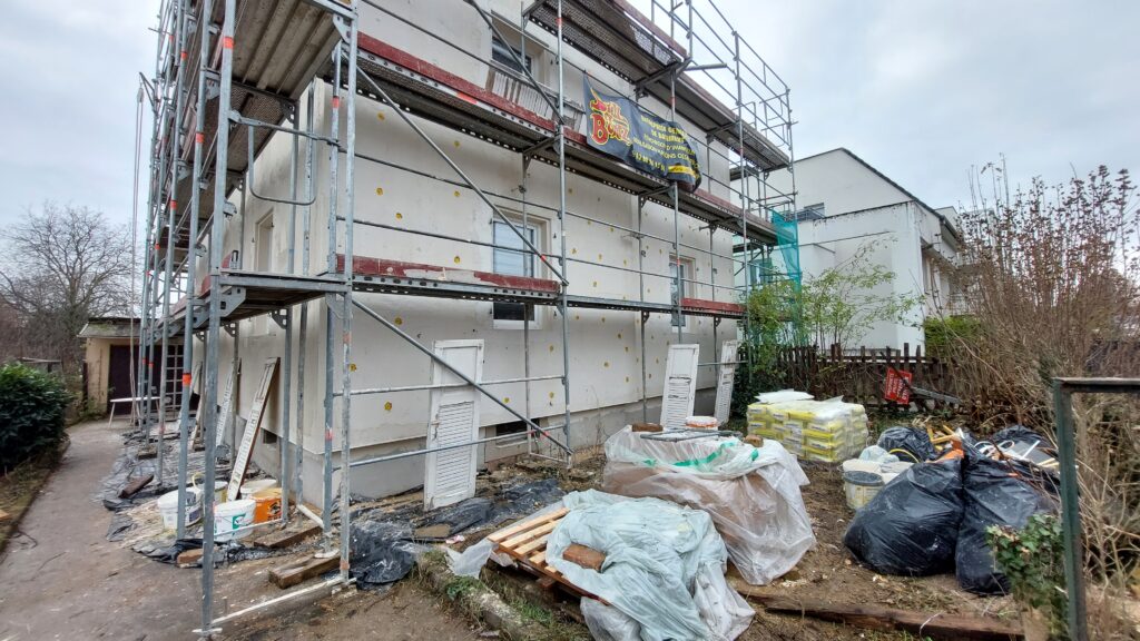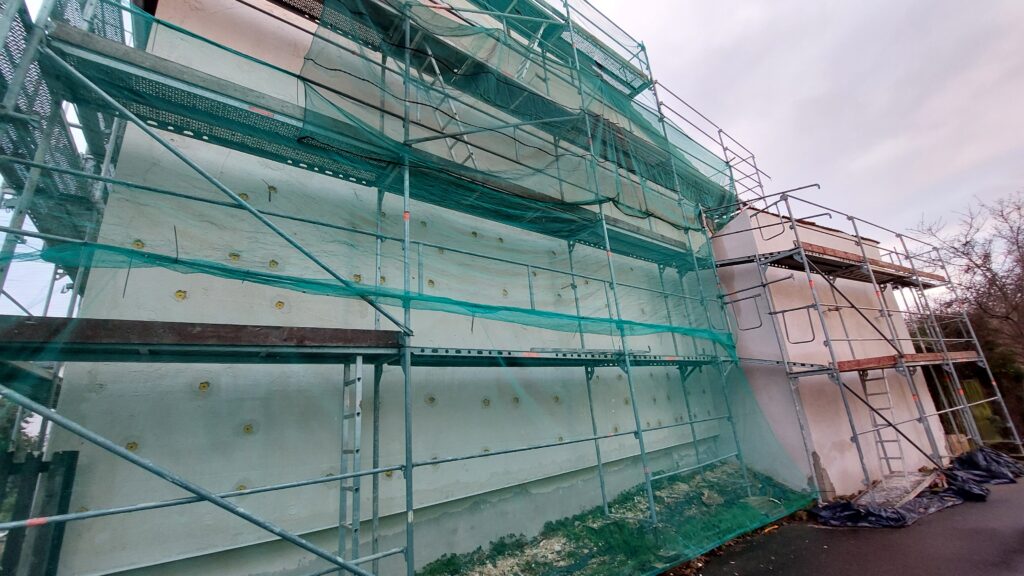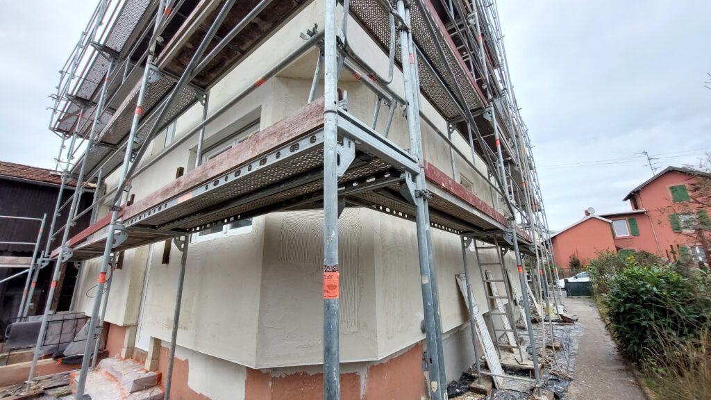 Mise en place des baguettes d’angle de façade sous l’isolant pour avoir une arrête bien droite