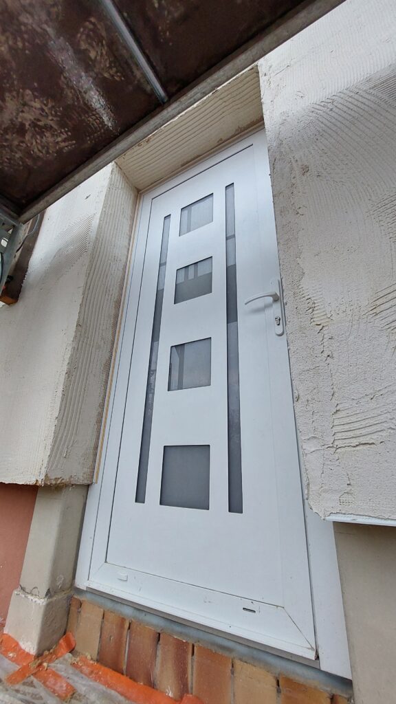Mise en place de panneaux isolants autour de la porte, collage et pose de la couche de colle crantée