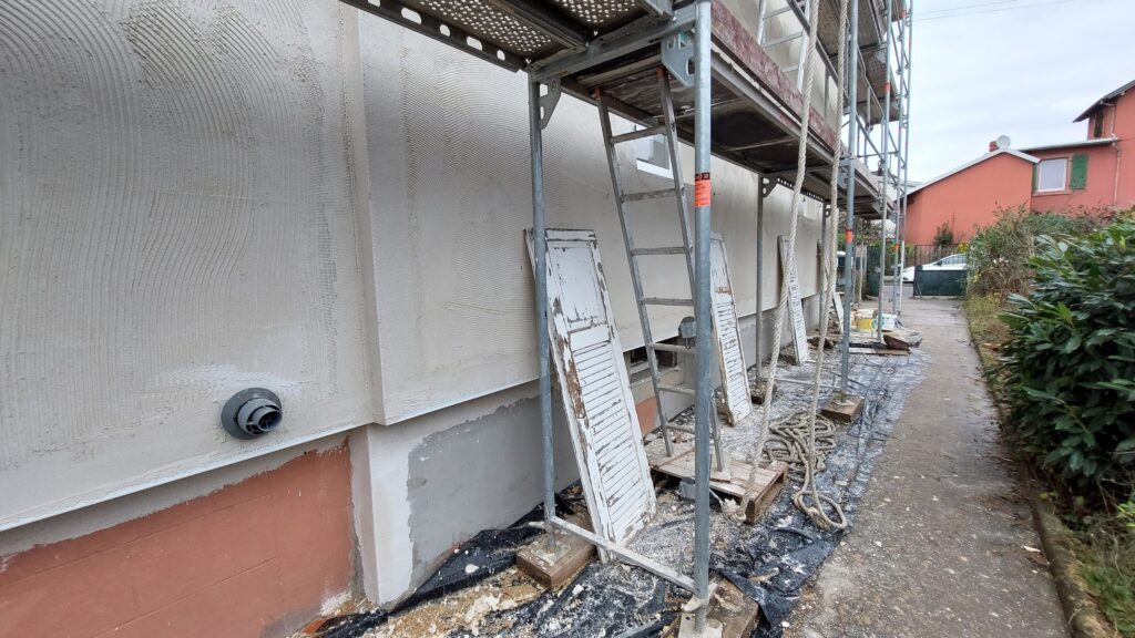 Mise en place d’un bloc de polystyrène sur les caissons de volets roulant, au sud, pour bien épouser le plan de la façade de recouvrir correctement le caisson