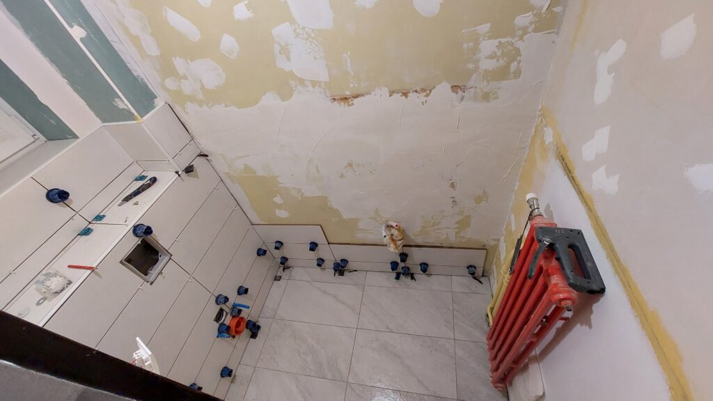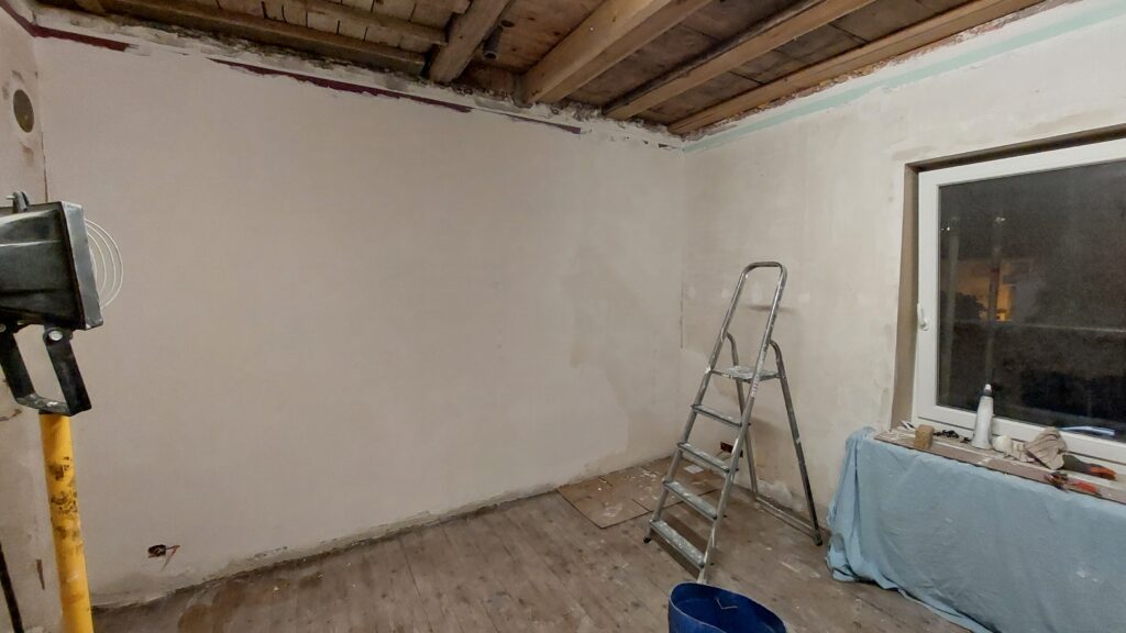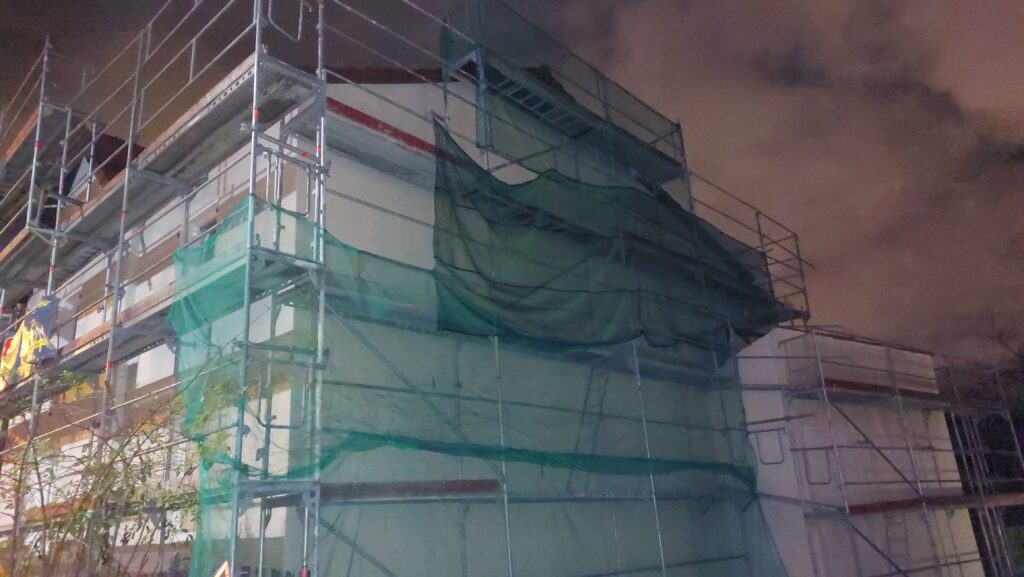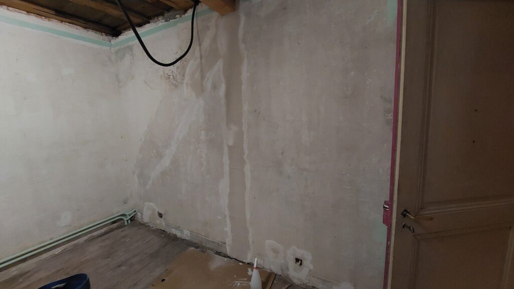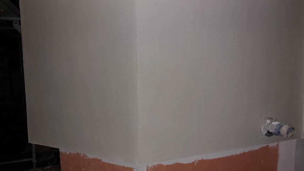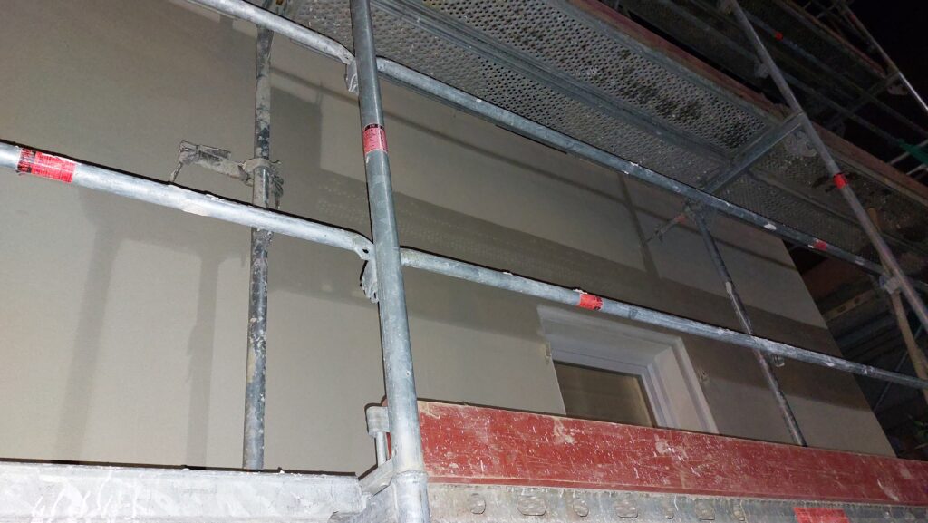 Mise en place du filet colle sur les façades Nord et Ouest. Finalisation au niveau du décrochement de la façade Est