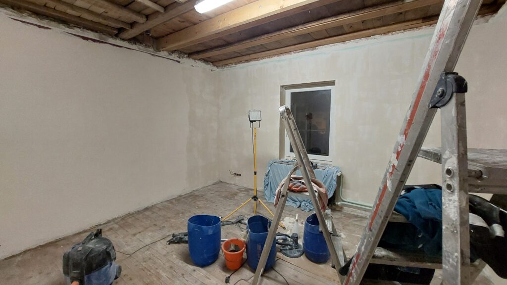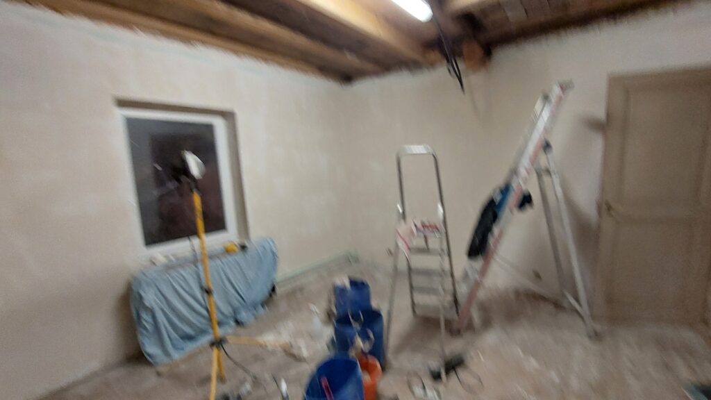 ponçage des murs de la chambre ouest et mise en place d’une seconde couche d’enduit