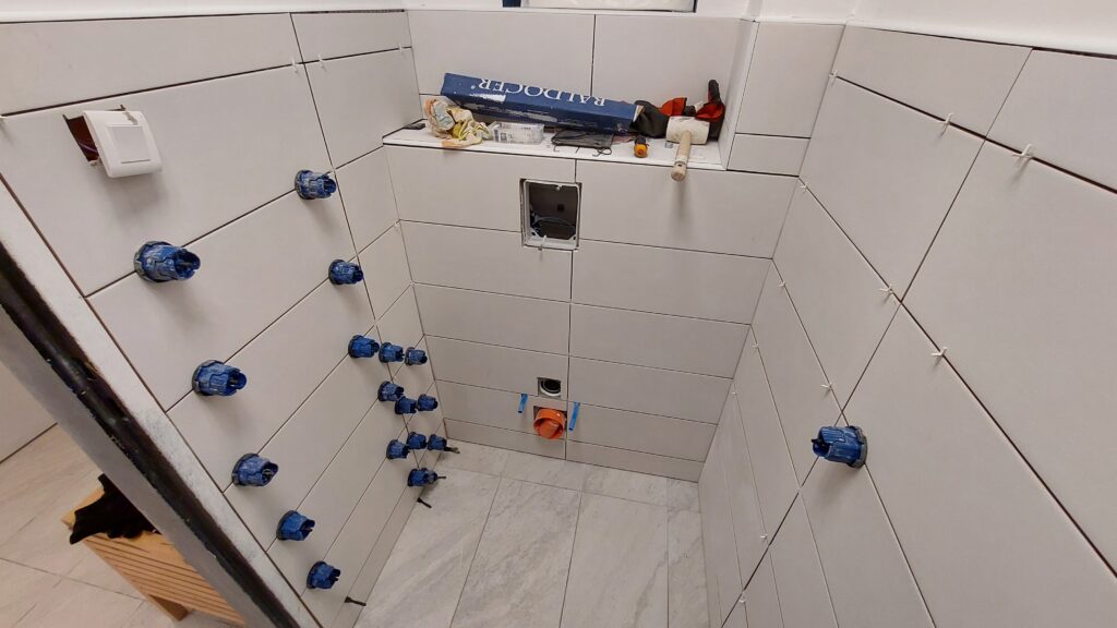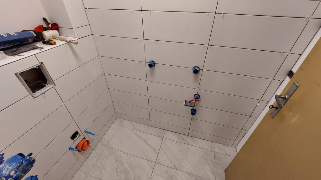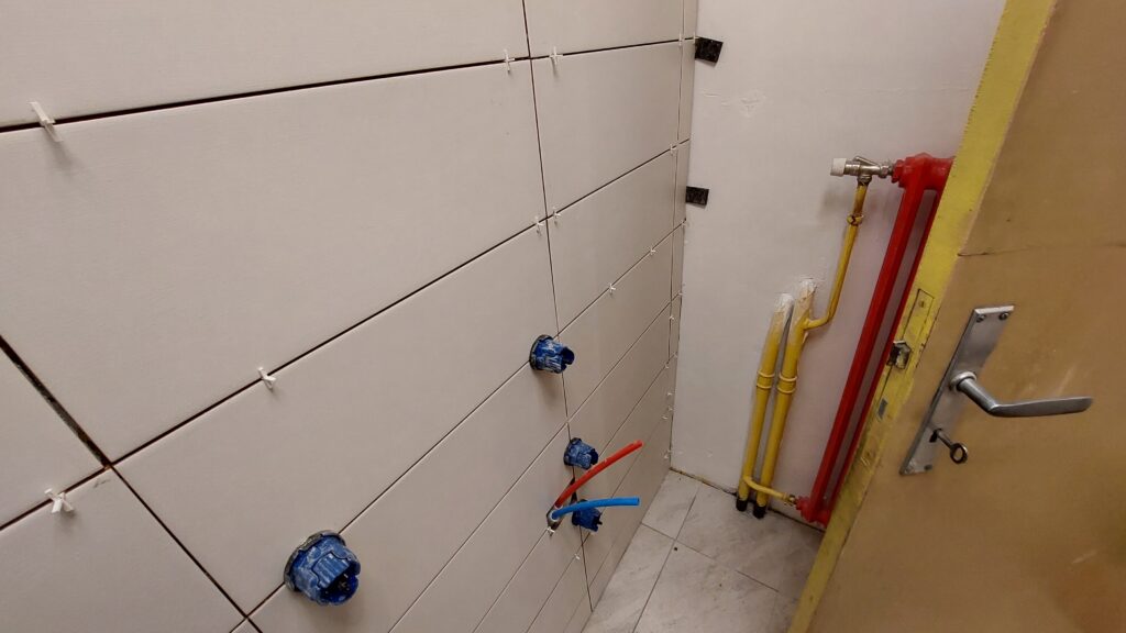 finition des carreaux de carrelage dans le WC. Restera les joints.