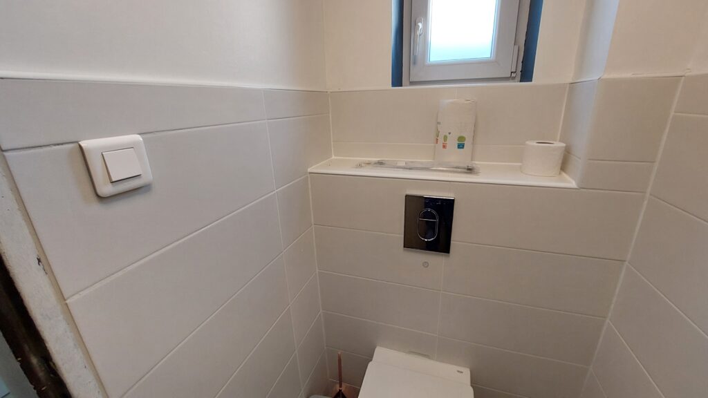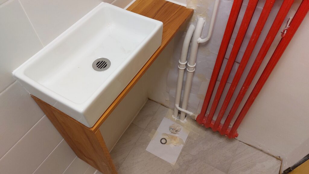 Dans le wc, finition des joints de carrelage, installation du lave-main et du siphon, peinture des tubes de radiateur, silicone sur les angles, vitrification du meuble sur-mesure
